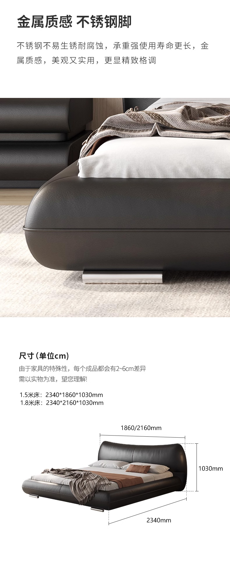维利品尚 现代简约 接触面真皮+实木内架+碳素钢五金脚+10公分钢木+松木排骨架 1.8米床