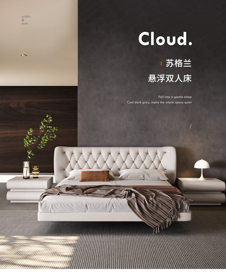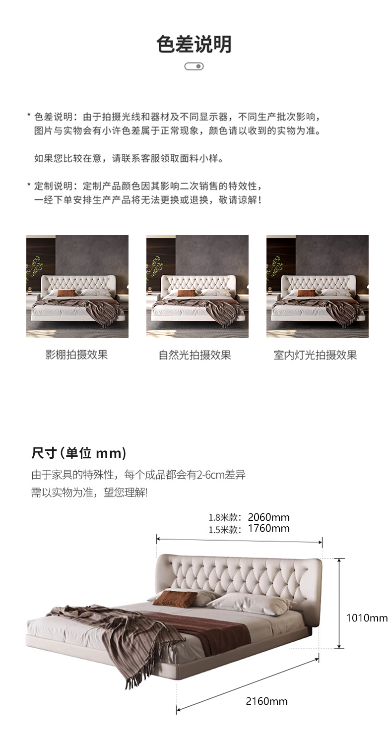 维利品尚 现代简约 接触面头层真皮+填充:竹炭海绵+实木内架+15公分排骨架+LED感应灯 1.8米悬浮床