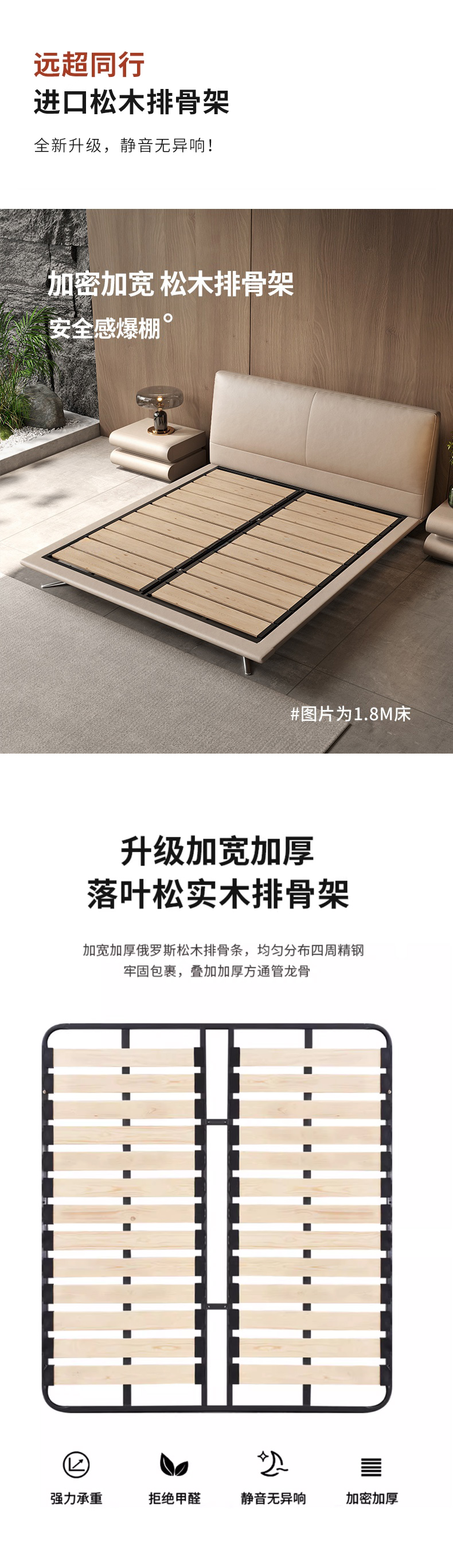 维利品尚 现代简约 接触面真皮+实木内架+碳素钢五金脚+10公分钢木+松木排骨架 1.8米床