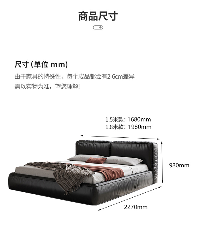 维利品尚 网红 接触头层真皮+实木内架+实木脚+15公分排骨架 1.8米床