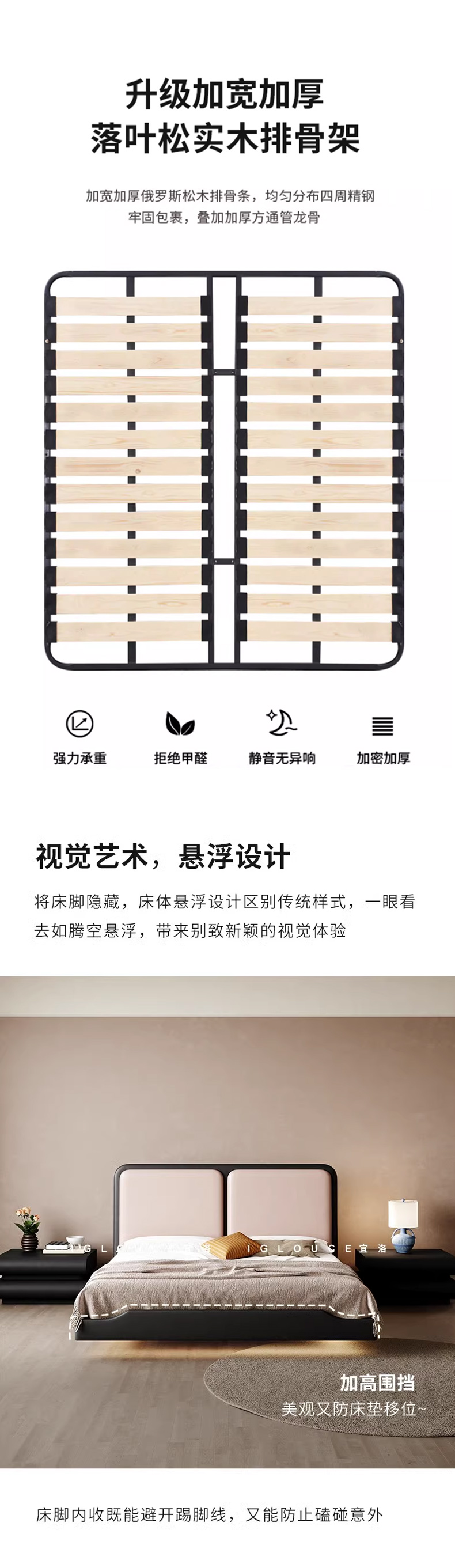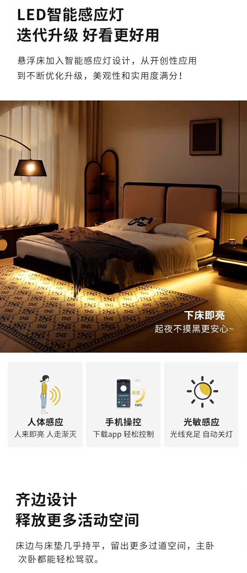 维利品尚 中古风 接触面头层真皮+填充:竹炭海绵+实木内架+15公分排骨架+LED感应灯 1.5米悬浮床
