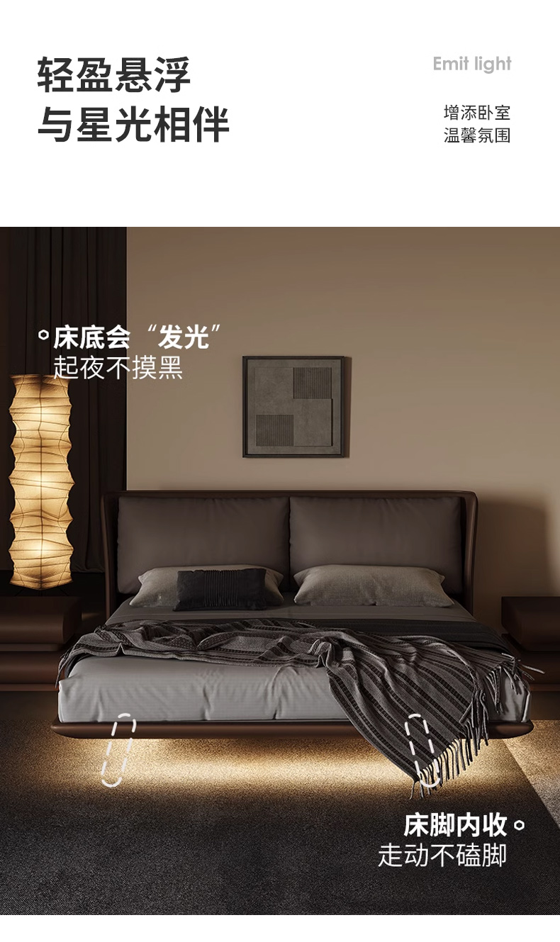 维利品尚 网红 接触面头层真皮+填充:竹炭海绵+实木内架+15公分排骨架+LED感应灯 1.8米床 悬浮床¥5163