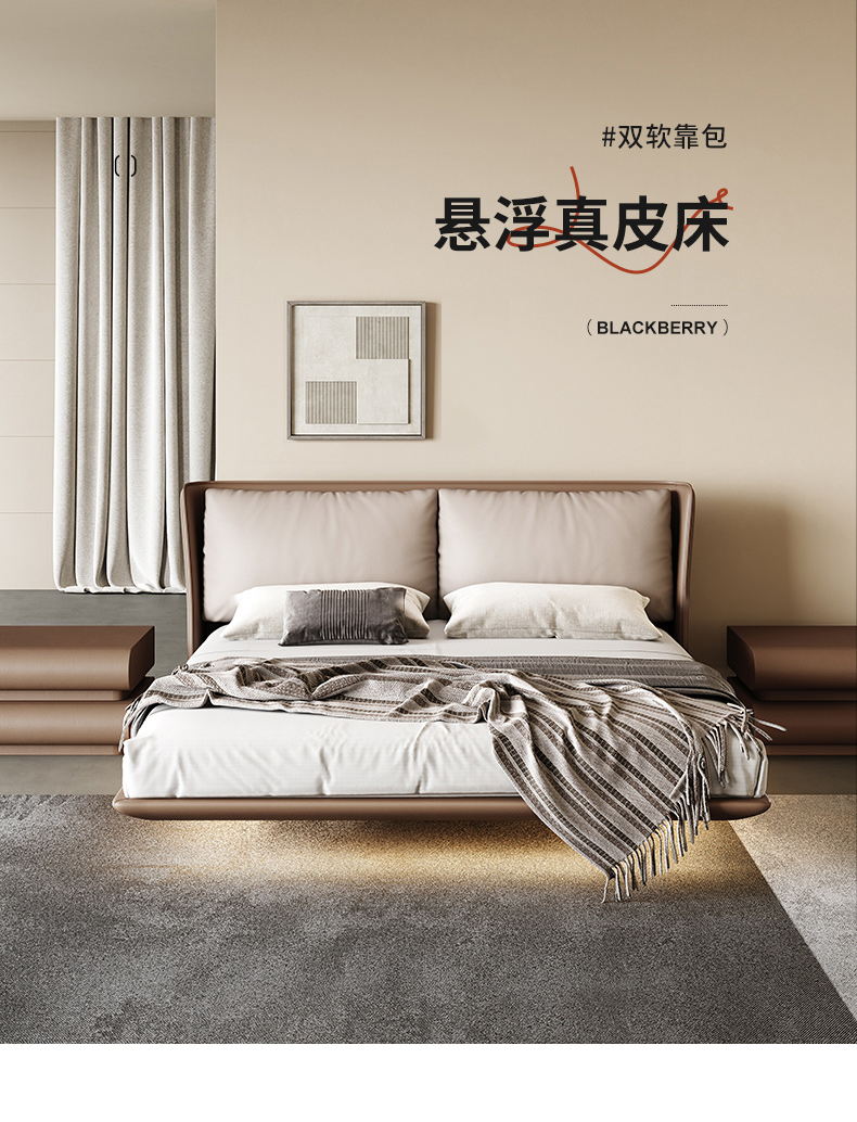 维利品尚 网红 接触头层真皮+靠包:羽绒+羽丝棉+实木内架+15公分排骨架+LED感应灯 1.8米悬浮床