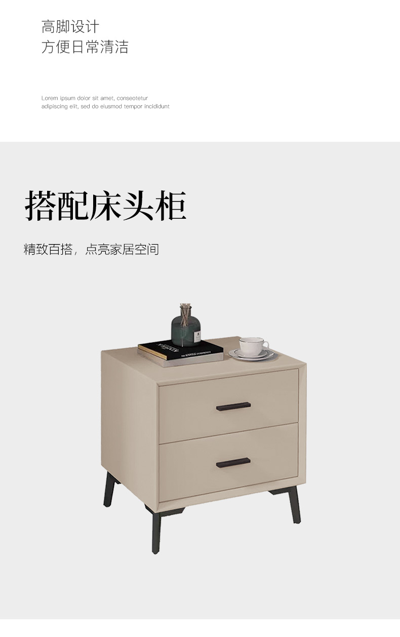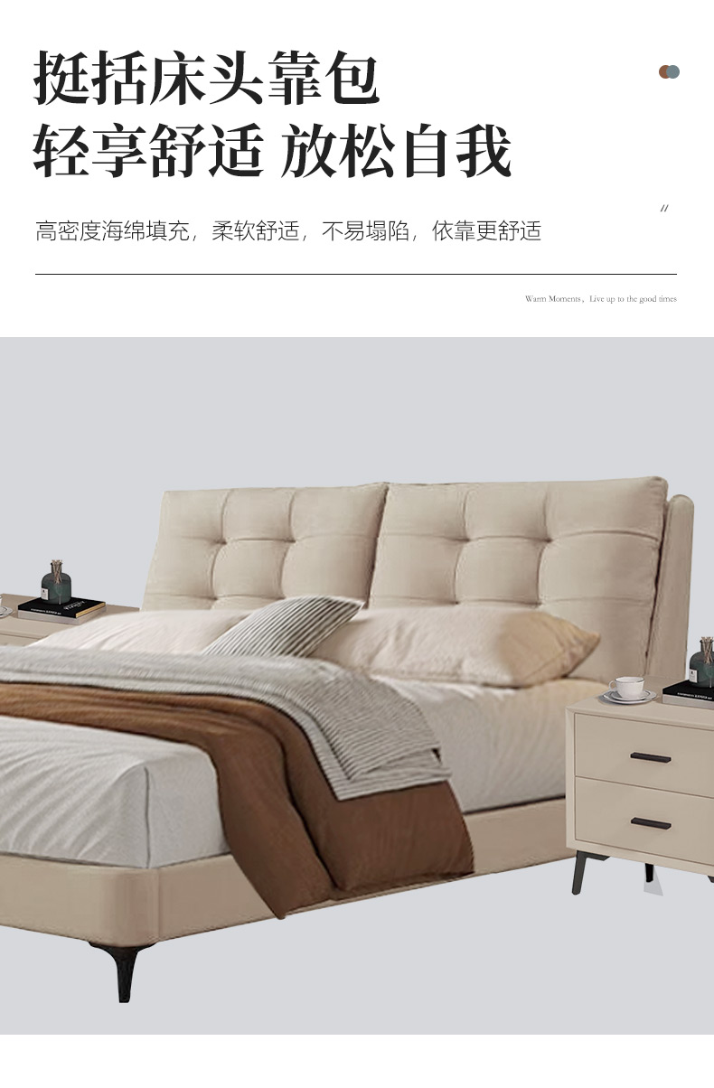 【套餐专享价】每屋优享系列 现代简约 接触面头层牛皮+仿皮+实木框架+钢木排骨架+胶脚 床头柜平面拉手/5分胶脚1.8米床+2床头柜¥3168