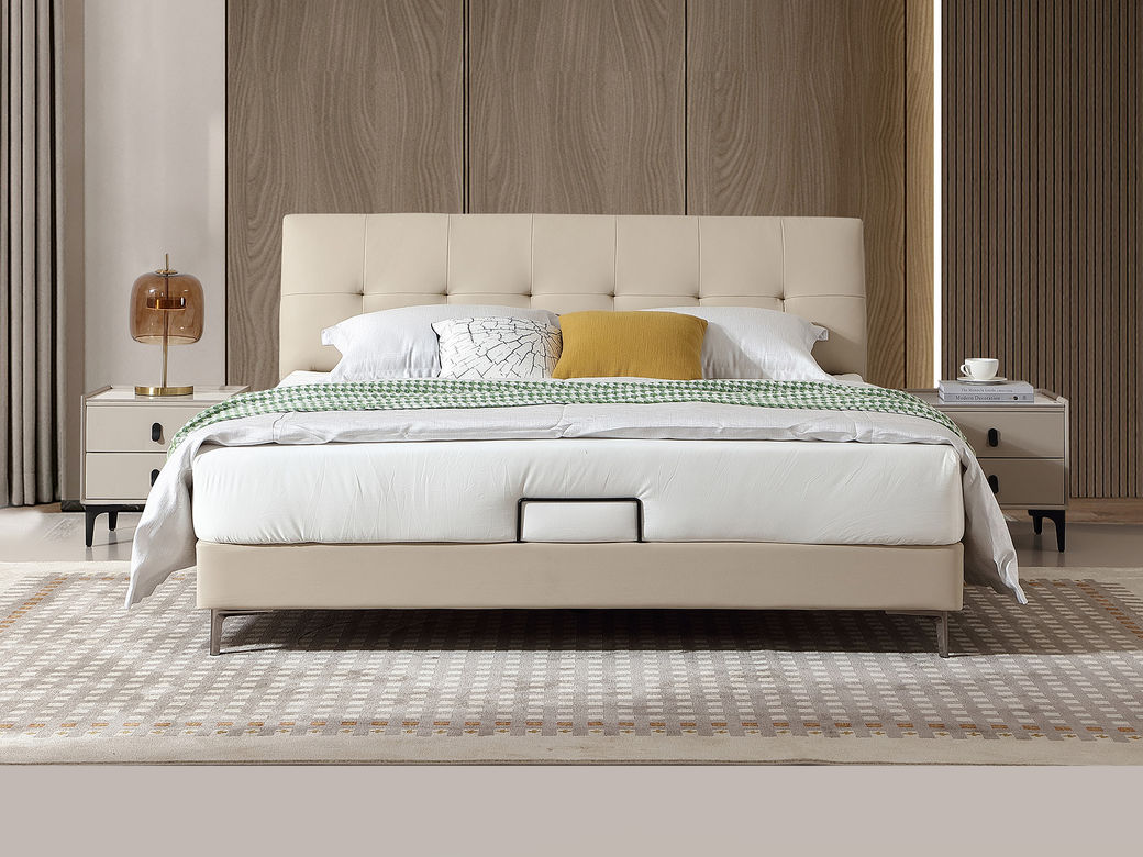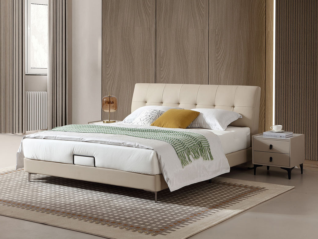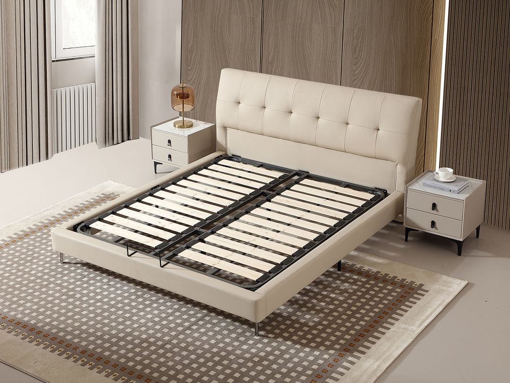 B系优选 现代简约 接触面进口头层牛皮+PVC 十公分钢木排骨架+进口实木 1.8米床+两个床头柜(价格不含高箱,如需定制请咨询客服)¥3248