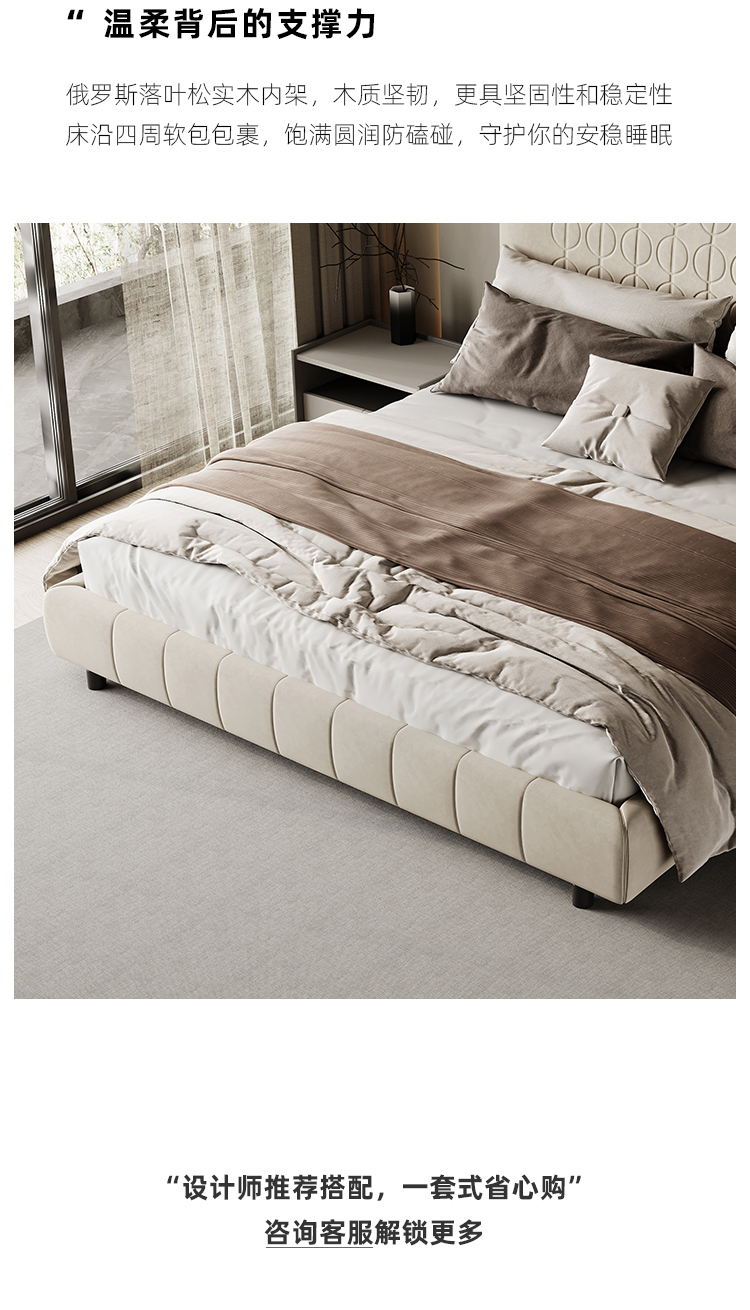 贝斯solo 设计师 网红 极简 布艺 俄罗斯进口落叶松 优质高回弹海绵靠包 钢木排骨架 Kelly床 1.8米床| 商品详情 | 规格参数 | 评价(0) | 购买咨询() | 产品实拍图 | 服务标准 |