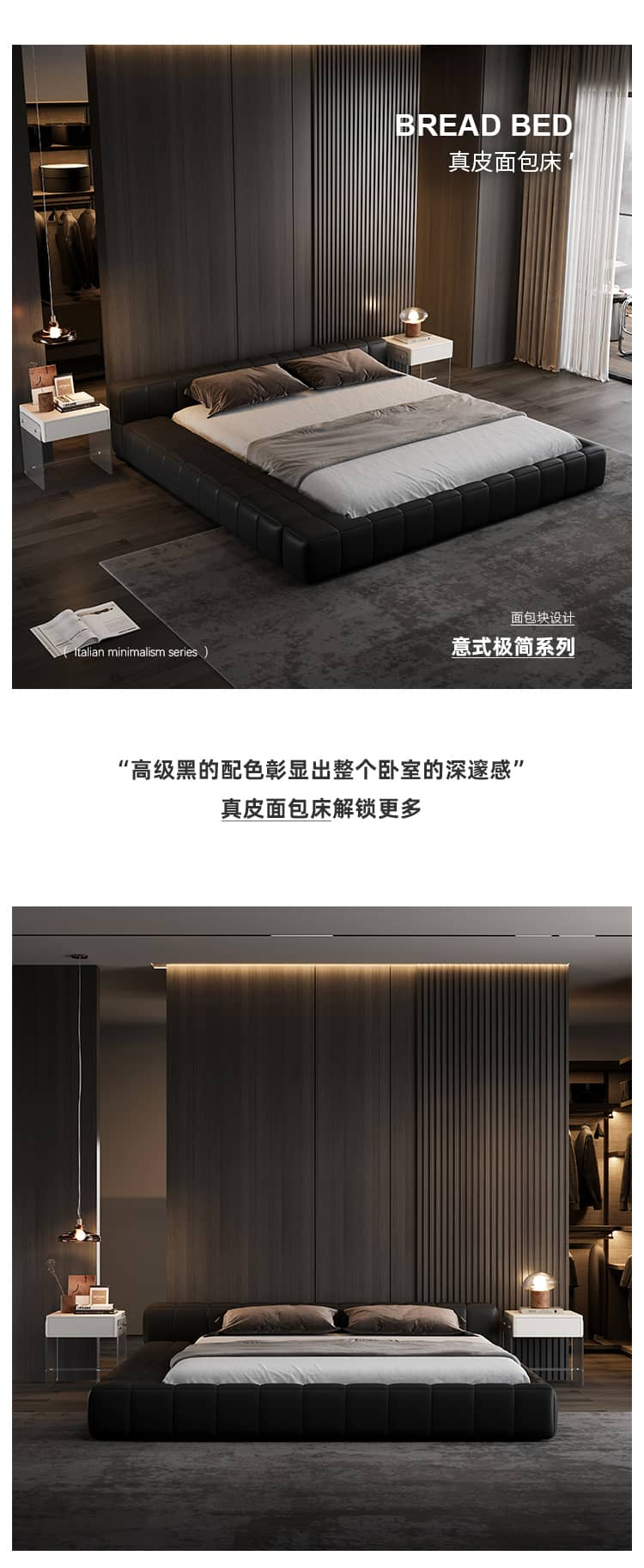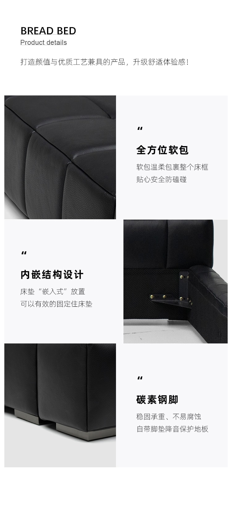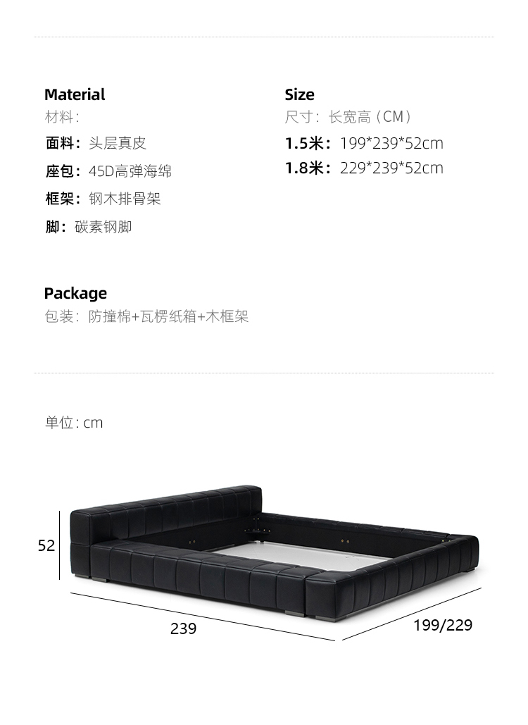 洛萨 极简 接触面真皮 进口松木内架 高回弹海绵 钢木排骨架 真皮面包床 1.8米床
