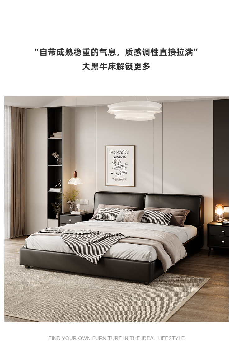 贝斯solo 设计师 网红 极简 全实木框架+钢木排骨架+接触面真皮 大黑牛床 1.8米床