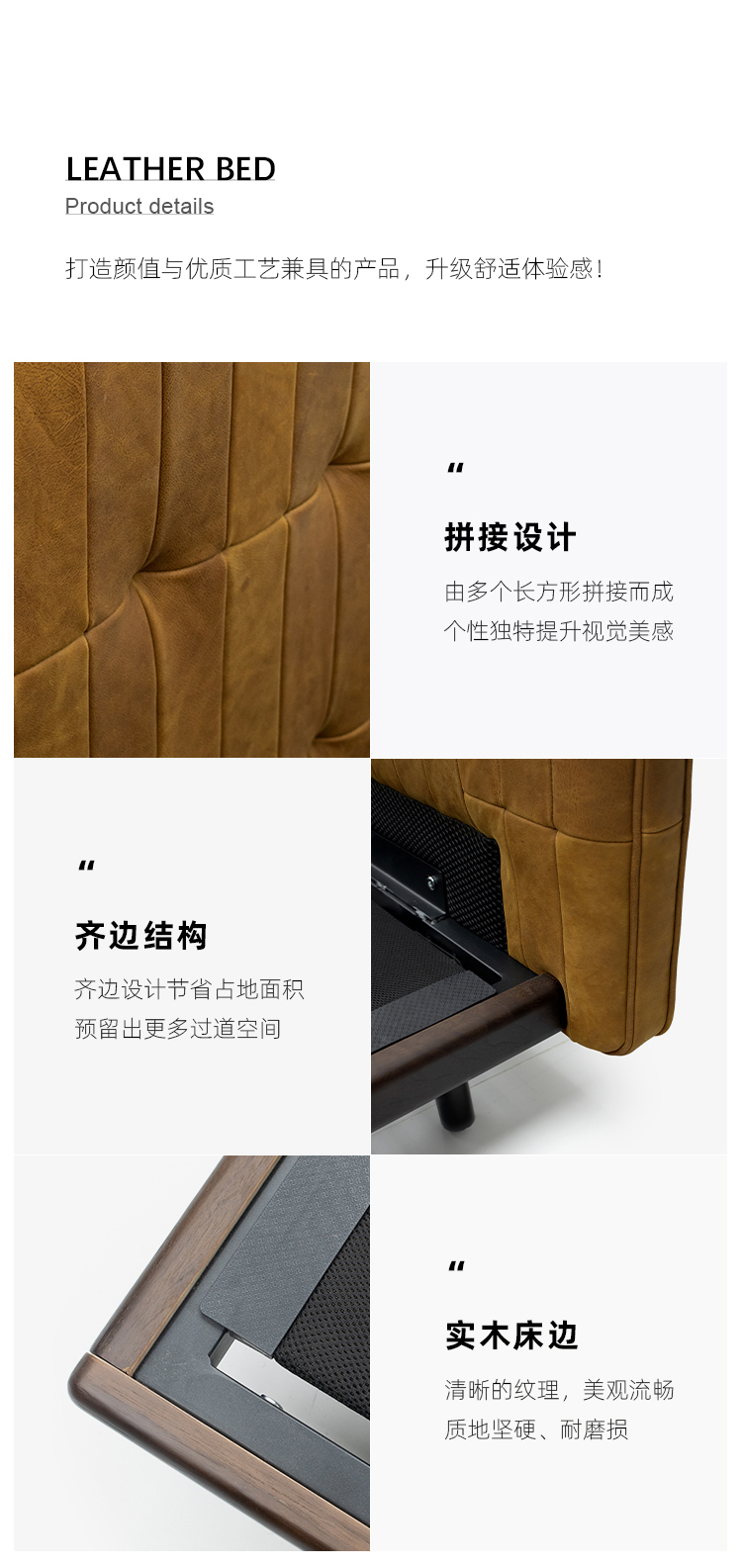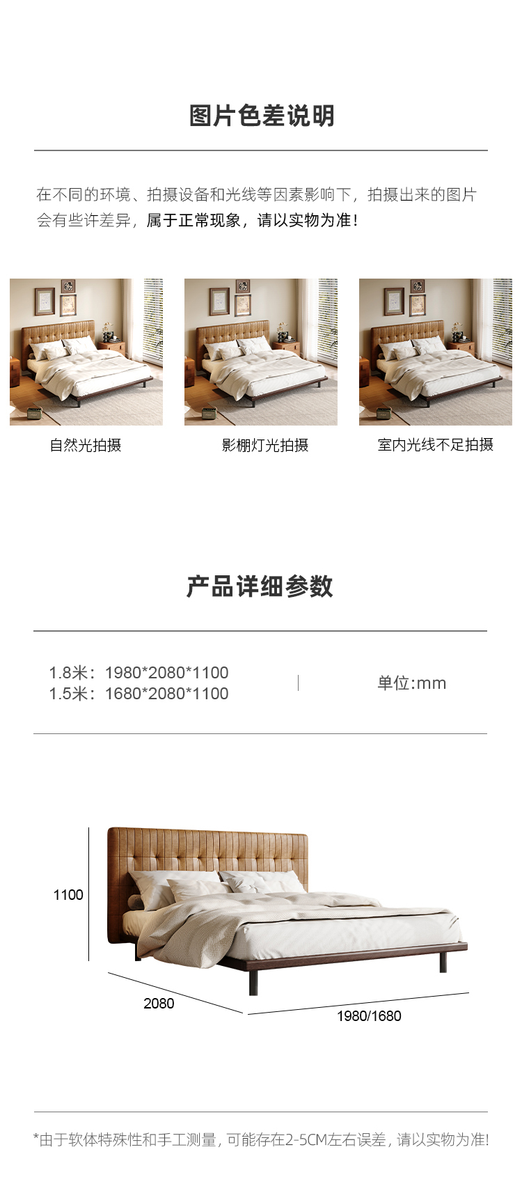 洛萨 极简 接触面真皮 进口松木内架 高回弹海绵 静音床板 意式拉点床 1.8米床