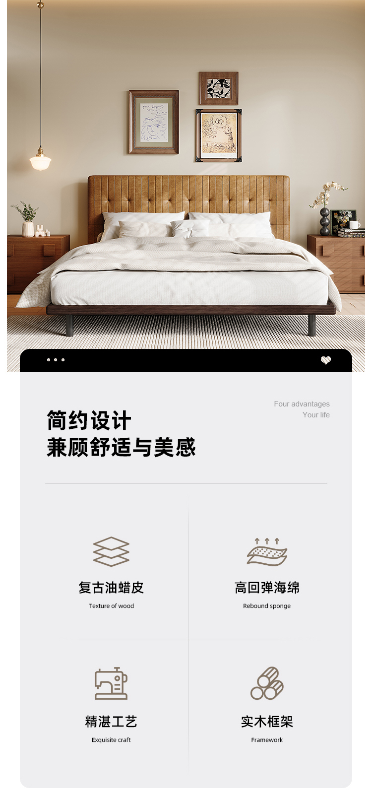 洛萨 极简 实木框架+高回弹海绵 油蜡皮床 1.8米床