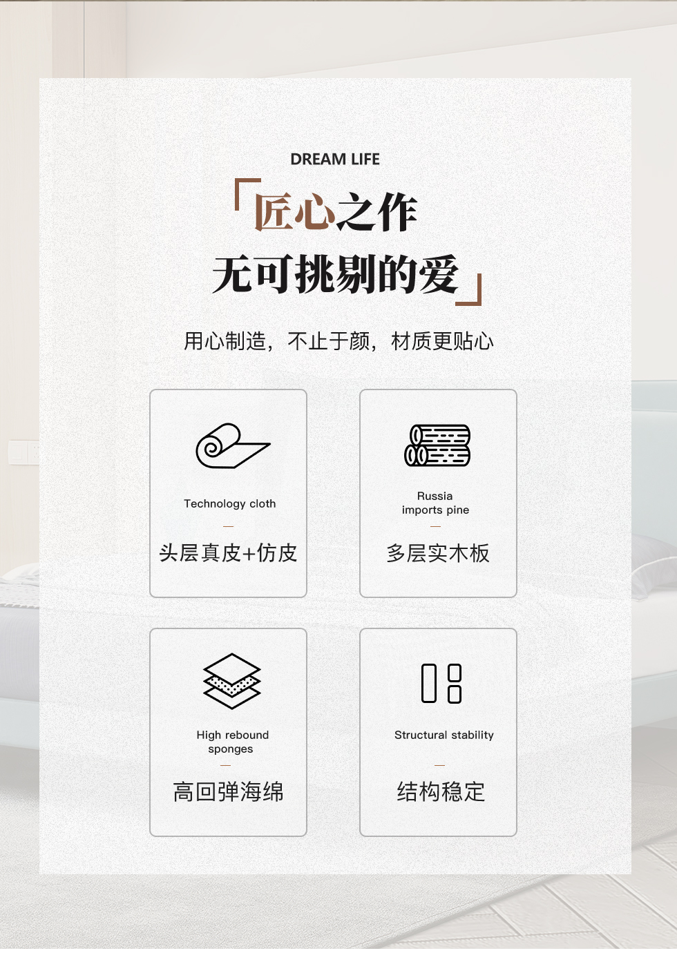 【套餐专享价】每屋优享系列 现代简约 实木内架+高回弹海绵+钢木排骨架+接触面头层真皮 1.8米床 |