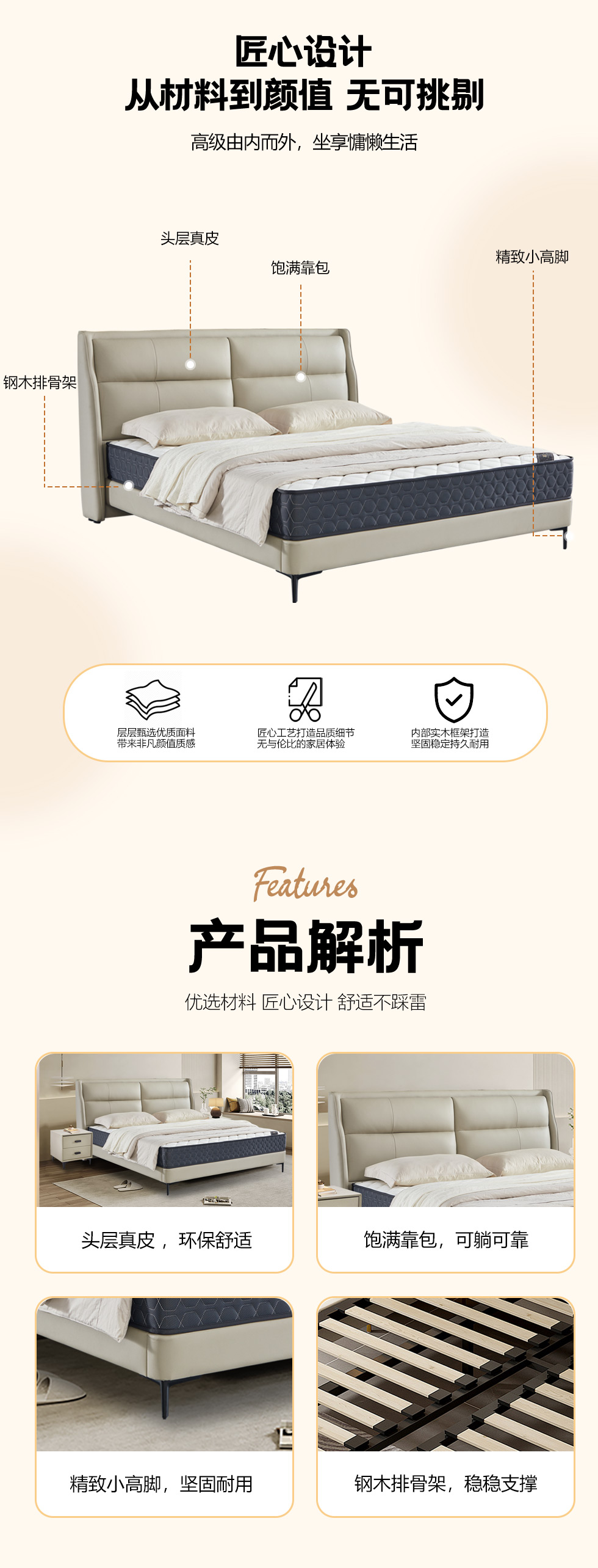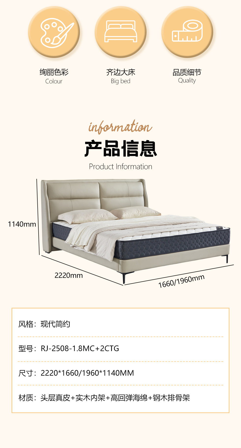 【套餐专享价】每屋优享系列 现代简约 实木内架+高回弹海绵+钢木排骨架+接触面头层真皮 1.5米床+床头柜*1