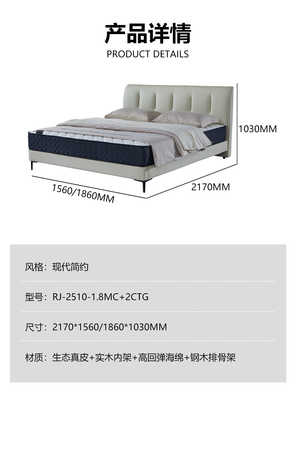 【套餐专享价】每屋优享系列 现代简约 实木内架+高回弹海绵+钢木排骨架+生态真皮 1.8米床+床头柜*2