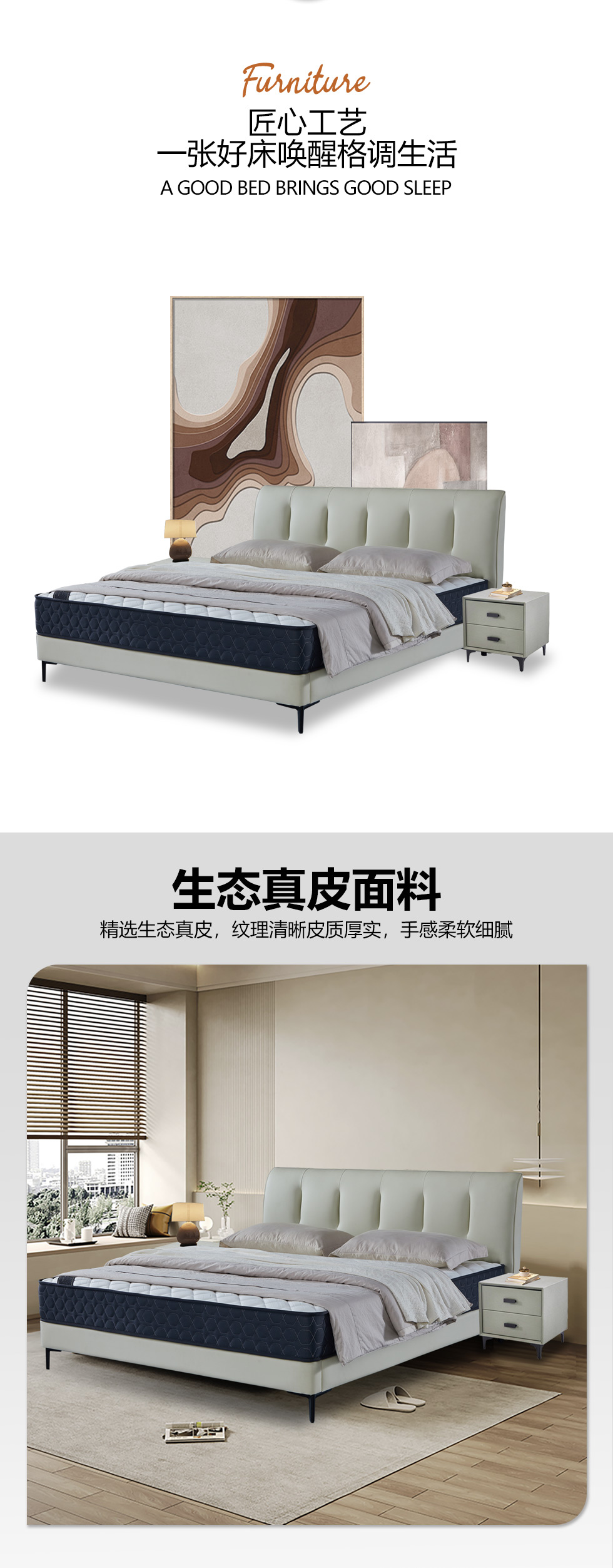 【套餐专享价】每屋优享系列 现代简约 实木内架+高回弹海绵+钢木排骨架+生态真皮 1.8米床+床头柜*2