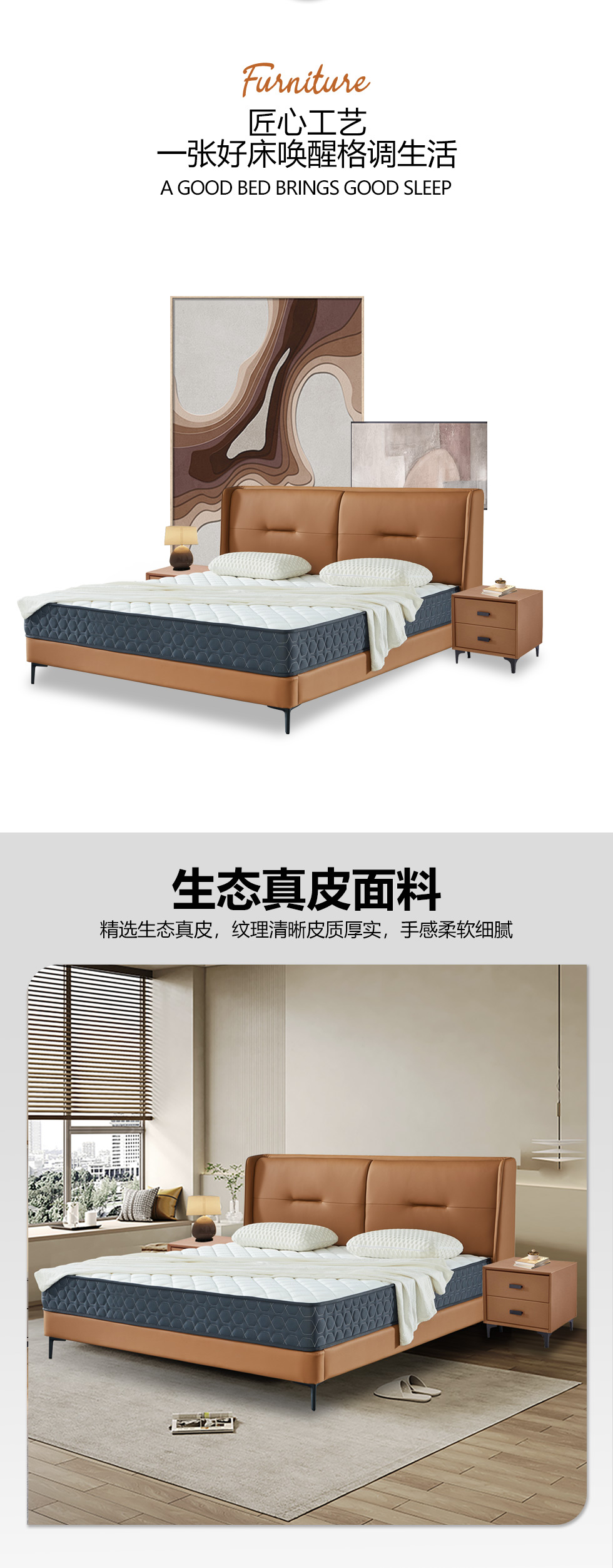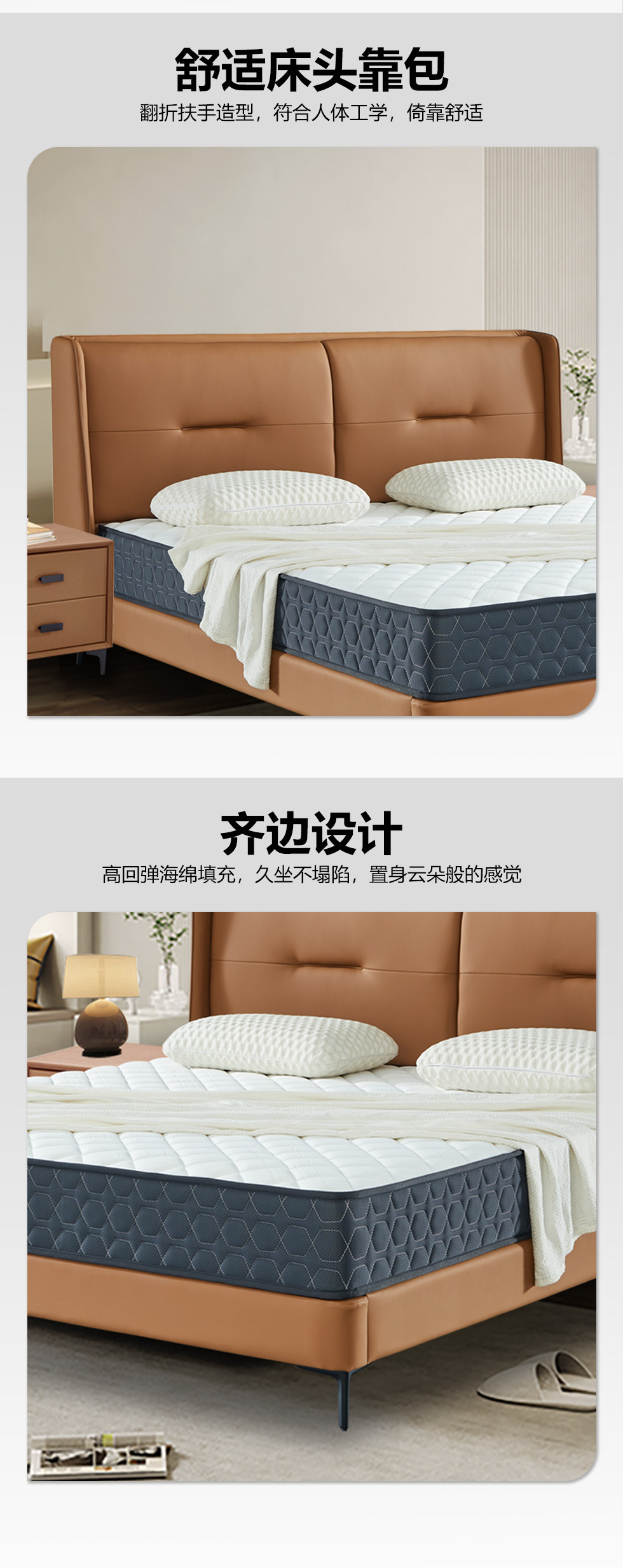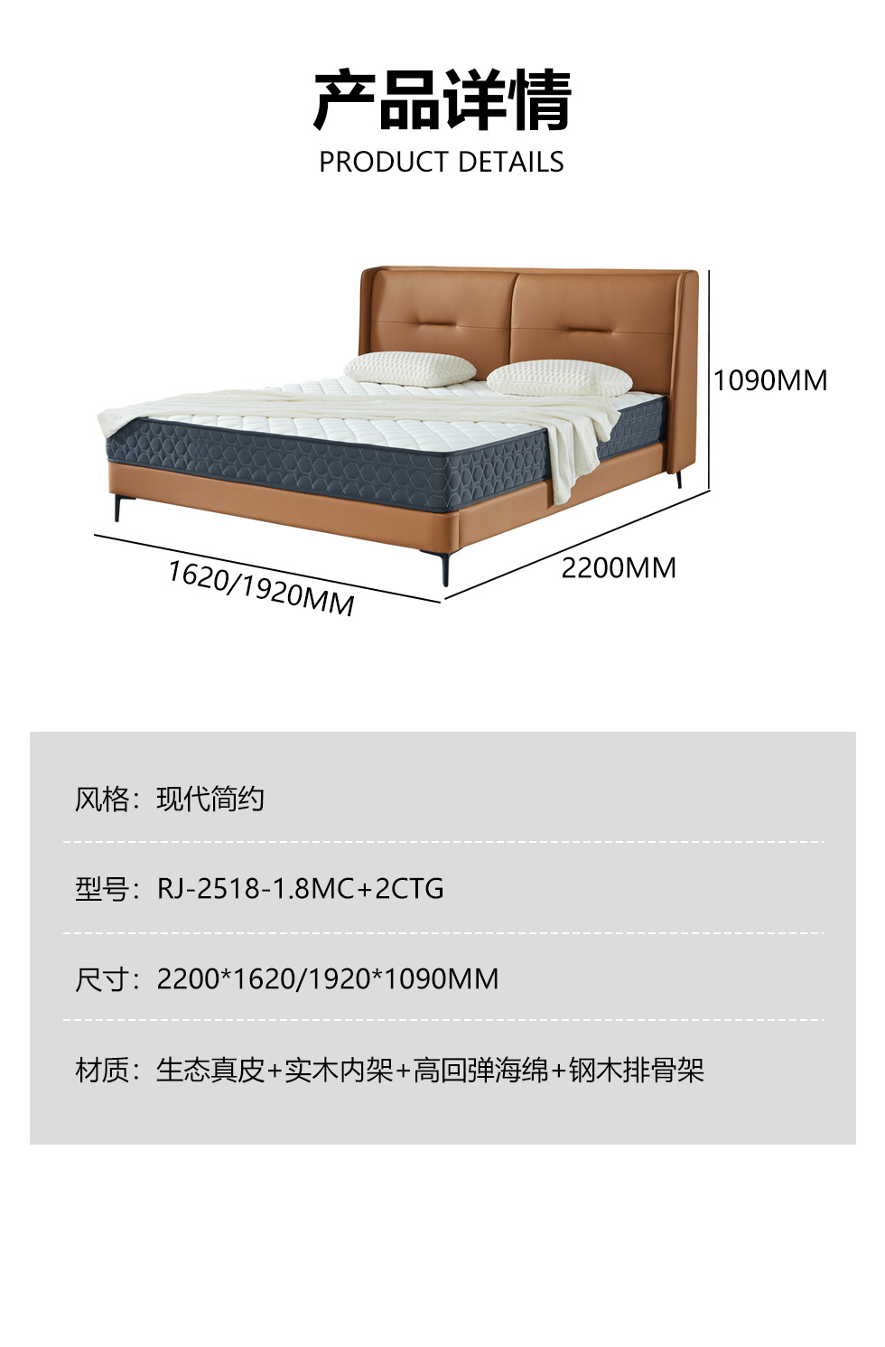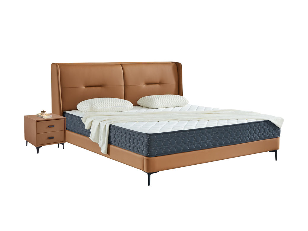 【套餐专享价】每屋优享系列 现代简约 实木内架+高回弹海绵+钢木排骨架+生态真皮+中纤板+仿皮+碳素钢脚 1.8米床+床头柜*2