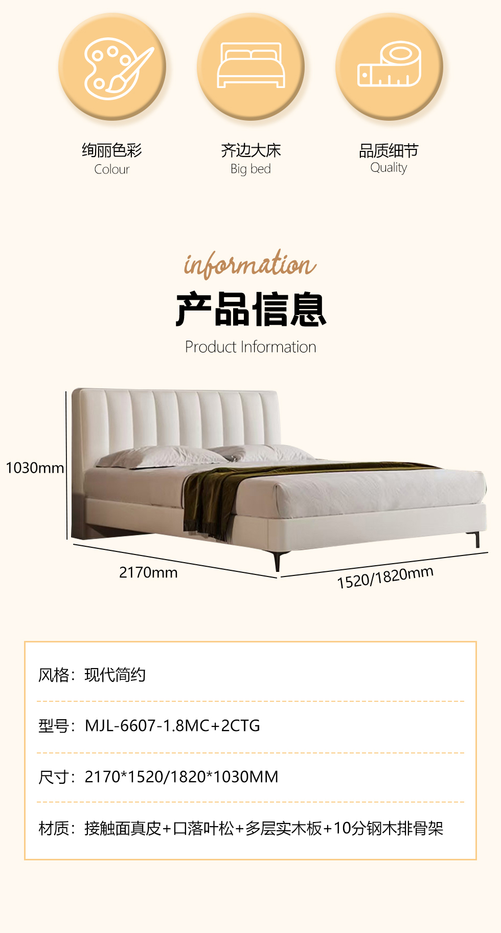 【套餐专享价】每屋优享系列 现代简约 实木内架+高回弹海绵+钢木排骨架+接触面头层真皮 1.8米床+床头柜*2【套餐专享价】每屋优享系列 现代简约 进口落叶松+多层实木板+10分拆装排骨架+接触面生态皮+高密度海绵靠包+碳素钢脚 1.8米床+2个床头柜