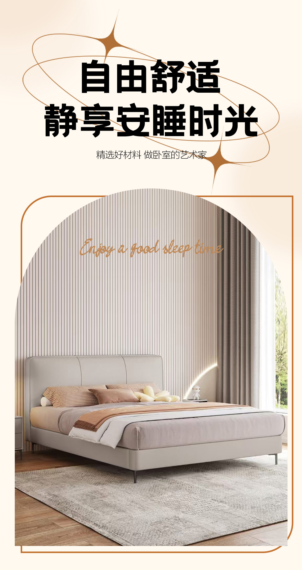 【套餐专享价】每屋优享系列 现代简约 接触面头层牛皮+仿皮+实木框架+钢木排骨架+胶脚 床头柜平面拉手/5分胶脚1.8米床+2床头柜¥3168