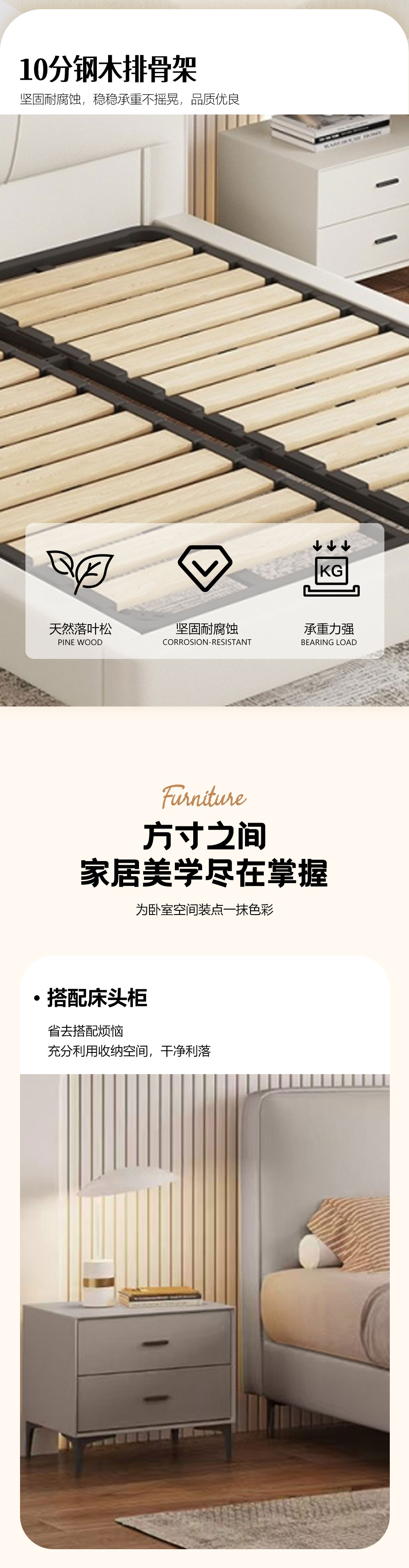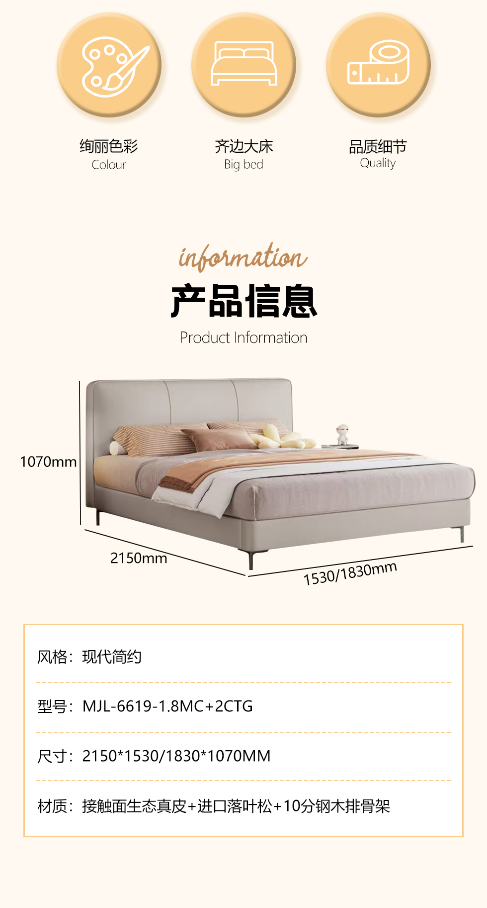 【套餐专享价】每屋优享系列 现代简约 实木内架+高回弹海绵+钢木排骨架+接触面头层真皮 1.8米床+床头柜*2【套餐专享价】每屋优享系列 现代简约 进口落叶松+多层实木板+10分拆装排骨架+接触面生态皮+高密度海绵靠包+碳素钢脚 1.8米床+2个床头柜