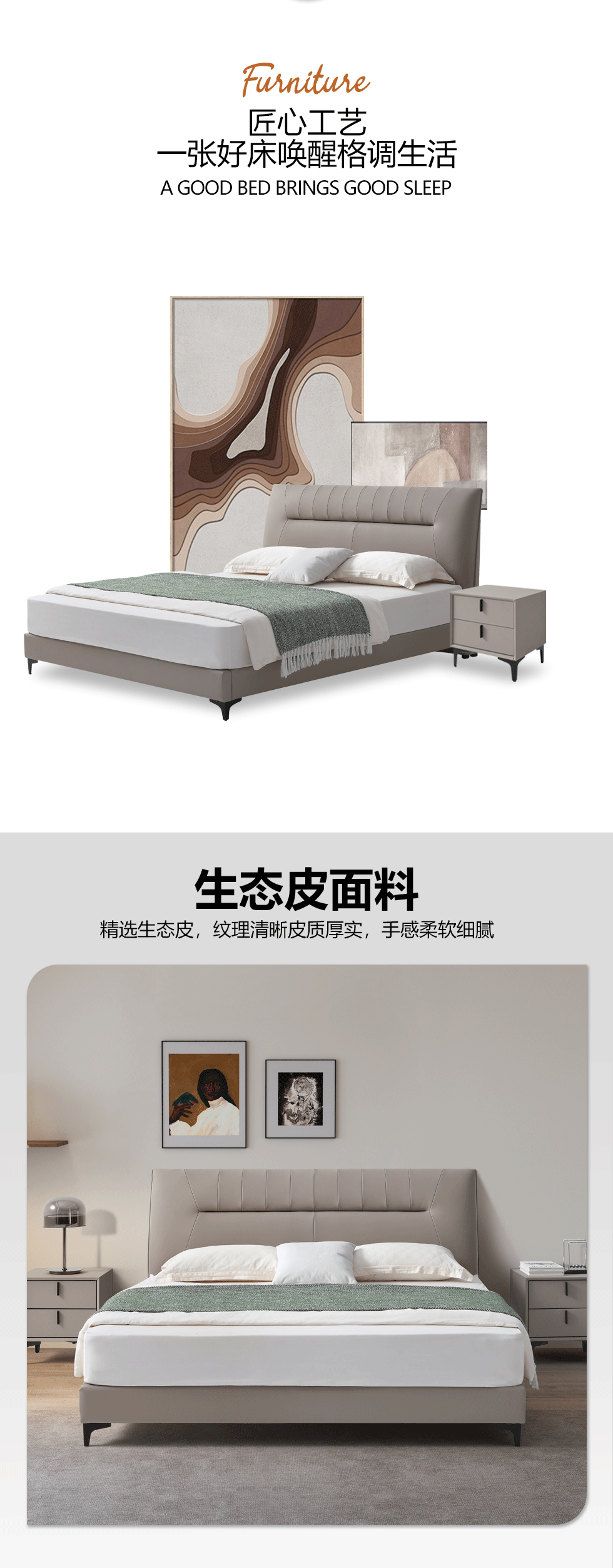 【套餐专享价】每屋优享系列 现代简约 松木内架+高回弹海绵+科技真皮 1.8米床+2个床头柜【套餐专享价】每屋优享系列 现代简约 进口落叶松+多层实木板+10分拆装排骨架+接触面生态皮+高密度海绵靠包+碳素钢脚 1.8米床+2个床头柜