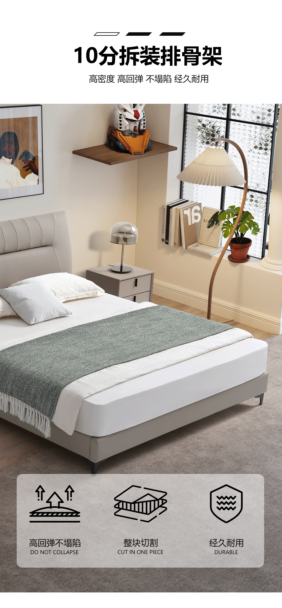 【套餐专享价】每屋优享系列 现代简约 进口落叶松+多层实木板+10分拆装排骨架+接触面生态皮+高密度海绵靠包+碳素钢脚 1.8米床