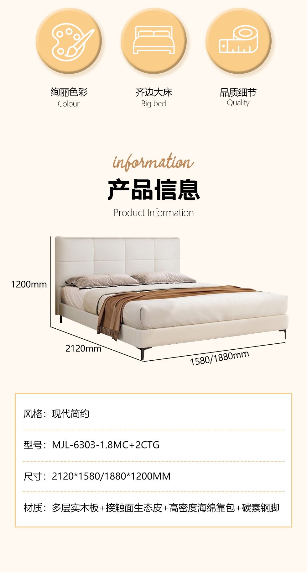 【套餐专享价】每屋优享系列 现代简约 松木内架+高回弹海绵+科技真皮 1.8米床+2个床头柜【套餐专享价】每屋优享系列 现代简约 进口落叶松+多层实木板+10分拆装排骨架+接触面生态皮+高密度海绵靠包+碳素钢脚 1.8米床+2个床头柜