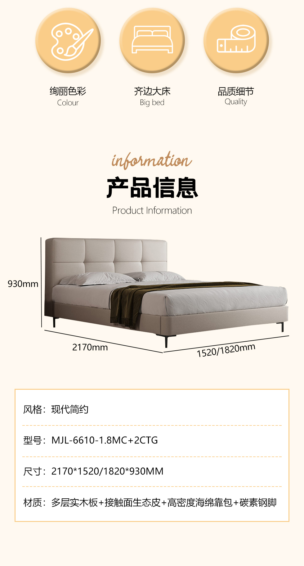 【套餐专享价】每屋优享系列 现代简约 松木内架+高回弹海绵+科技真皮 1.8米床+2个床头柜【套餐专享价】每屋优享系列 现代简约 进口落叶松+多层实木板+10分拆装排骨架+接触面生态皮+高密度海绵靠包+碳素钢脚 1.8米床+2个床头柜