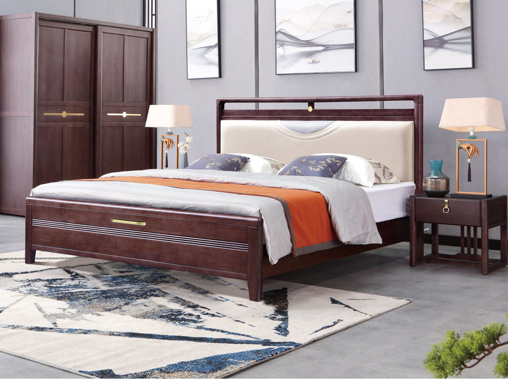山止 新中式 橡胶木+松木+科技布 紫檀色 1.8M床
