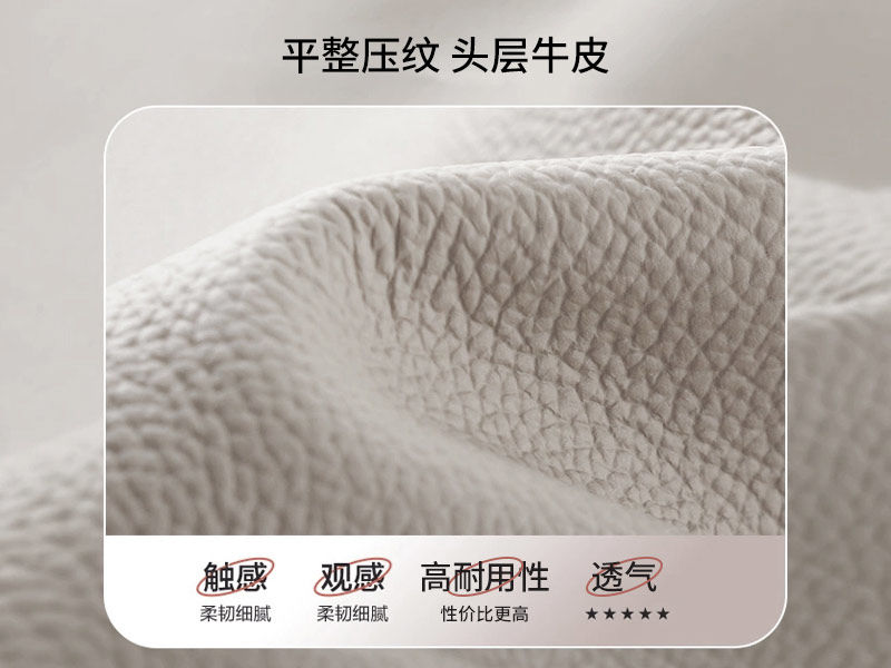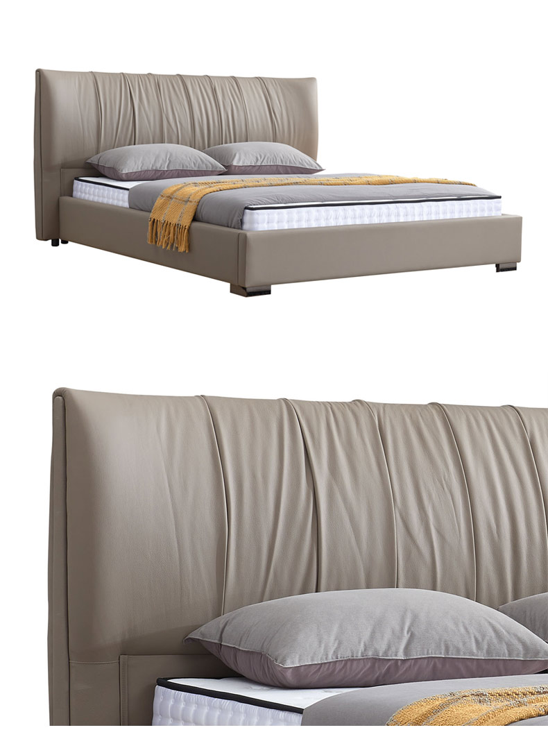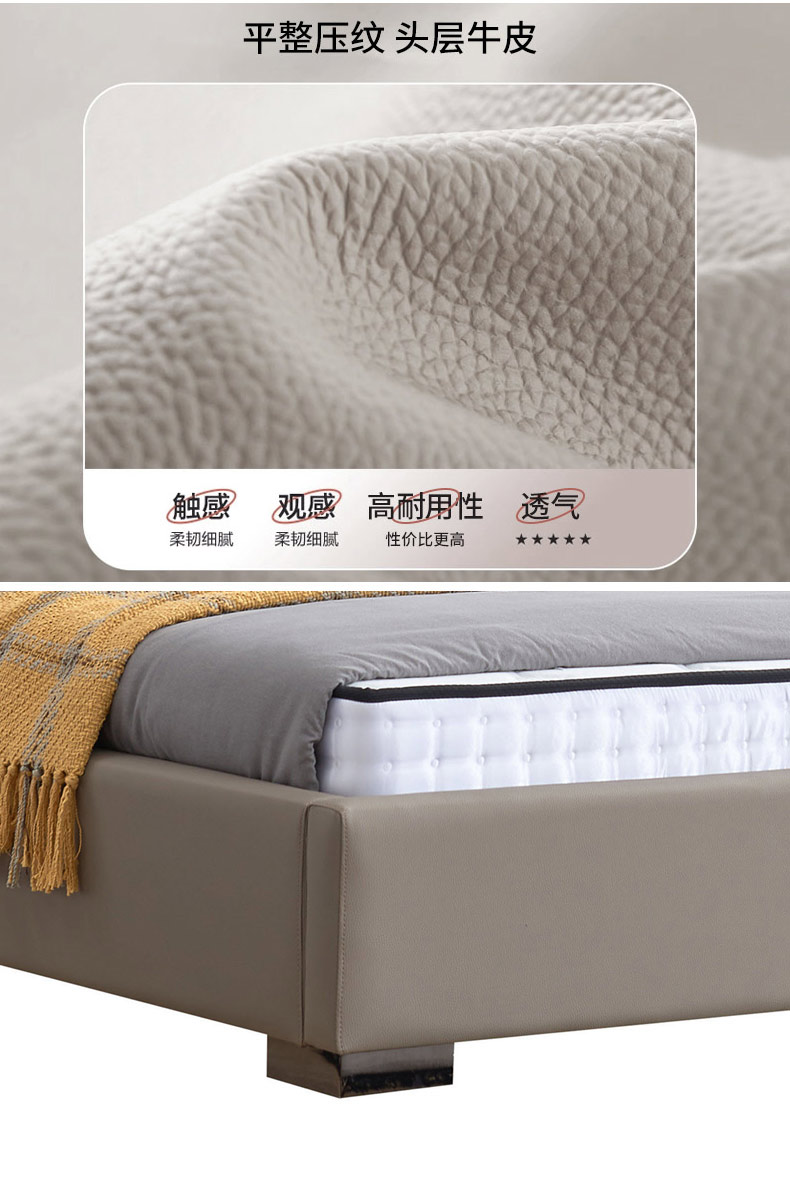 A系优选 现代简约 接触面头层牛皮+仿皮+高回弹海绵+实木框架+10分钢木排骨架+碳素钢五金脚 1.8米床