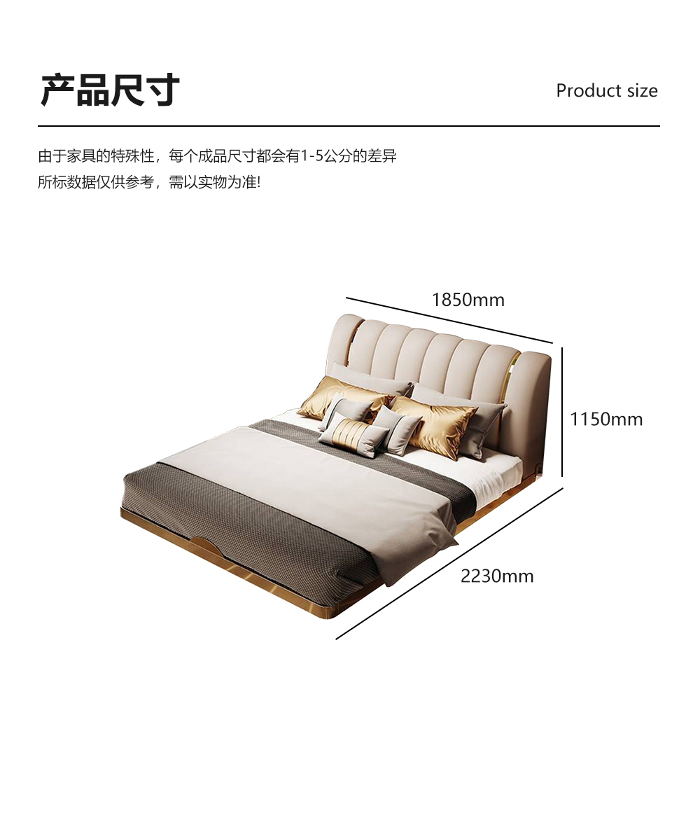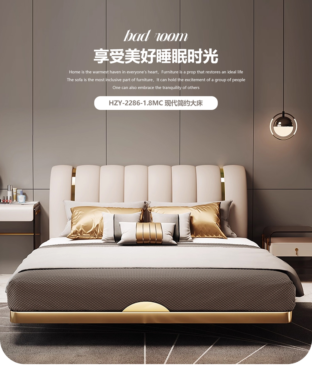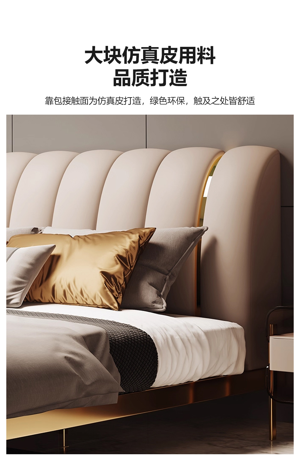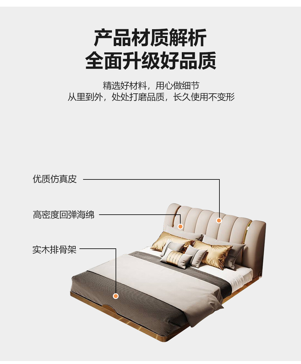 小红书系列 现代简约 实木框架+高回弹海绵+铜色不锈钢五金+仿真皮+仿皮 1.8米床