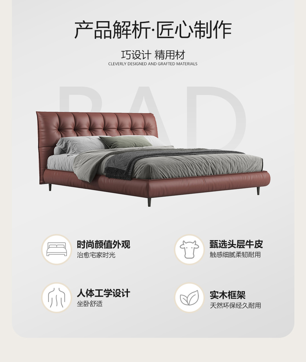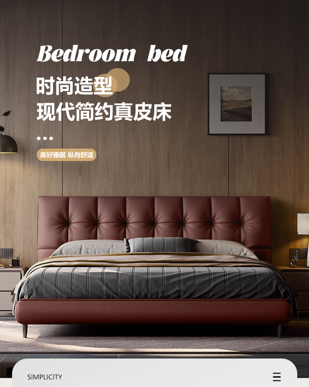 小红书系列 现代简约 实木框架+高回弹海绵+接触面头层牛皮 1.5米床