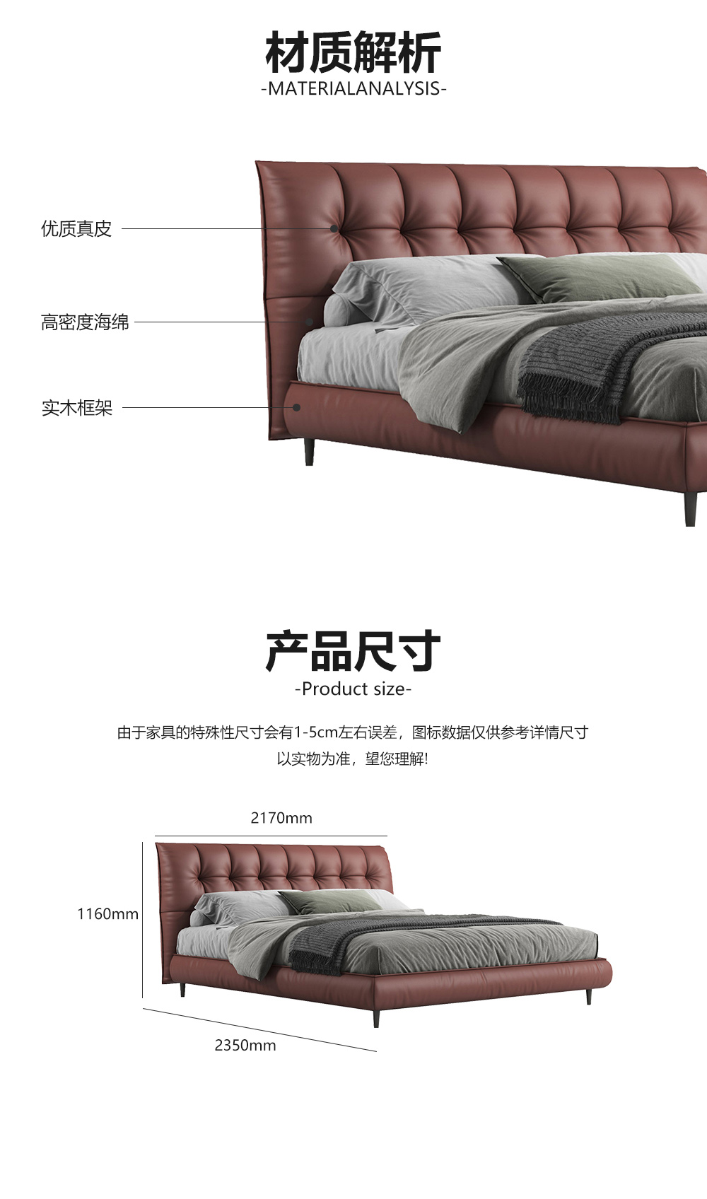 小红书系列 现代简约 实木框架+高回弹海绵+接触面头层牛皮+仿皮 1.8米床