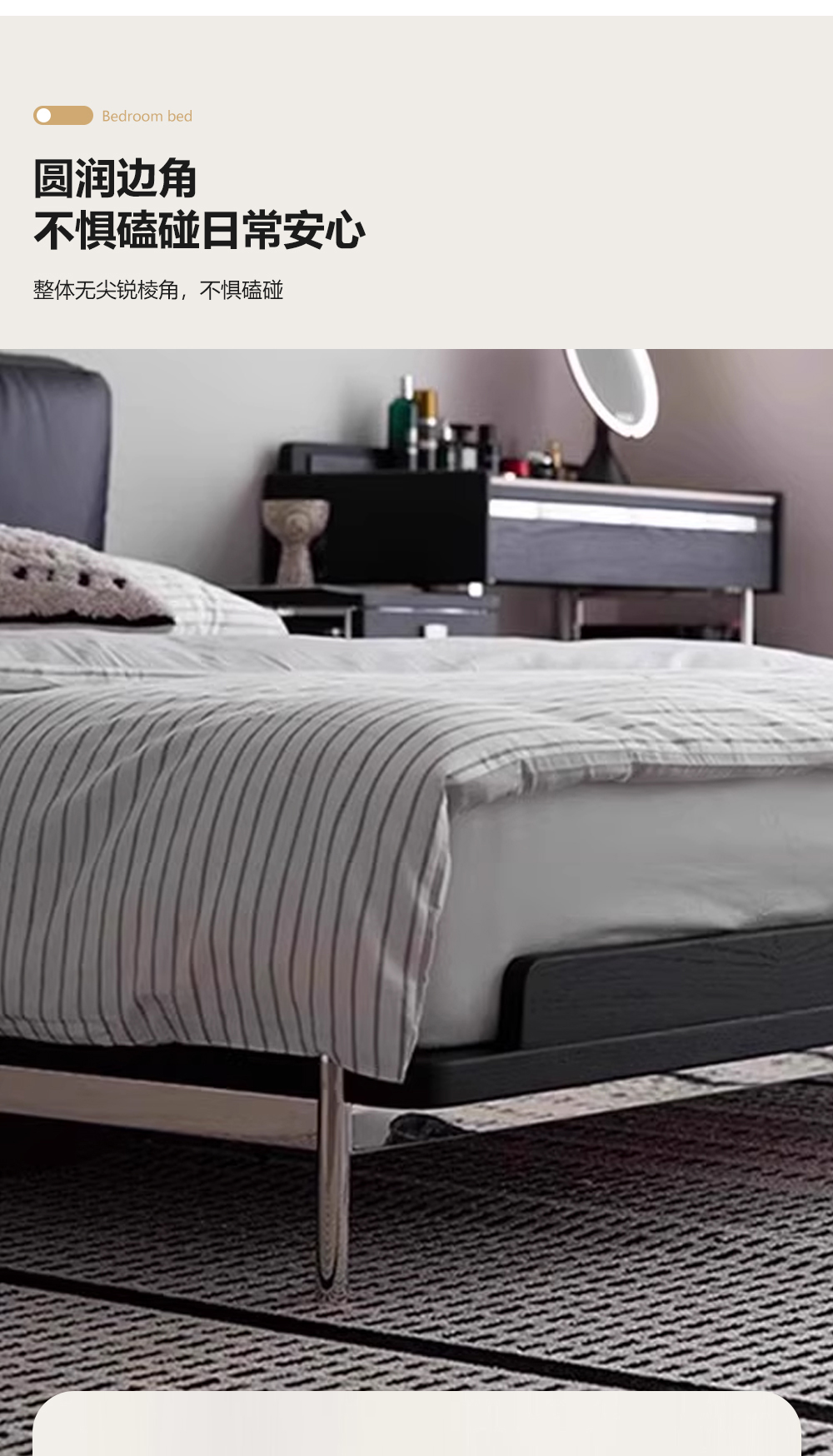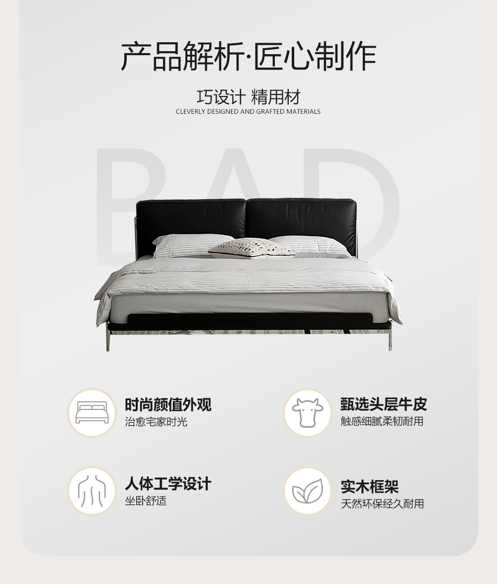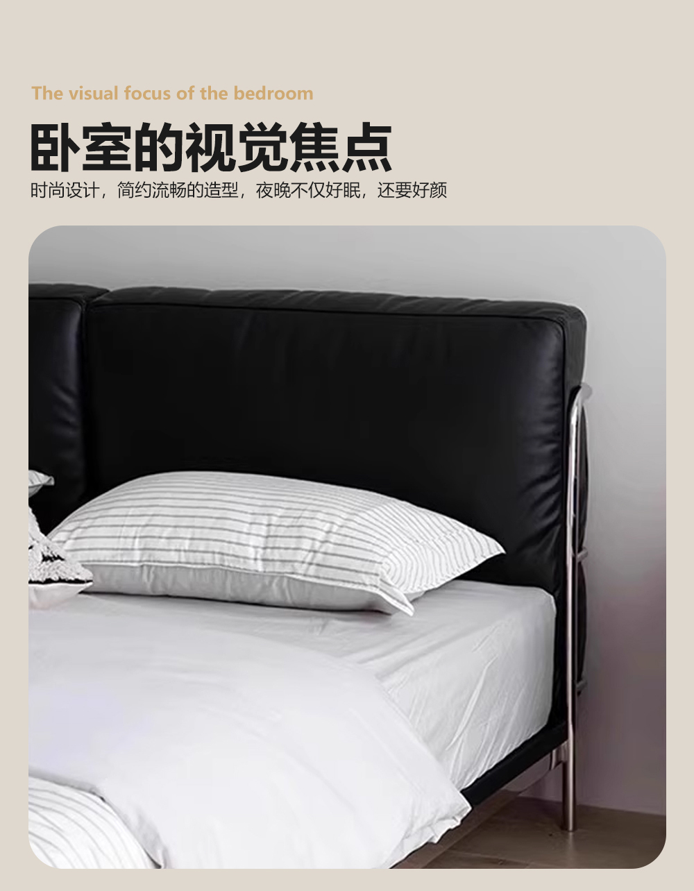 小红书系列 现代简约 实木框架+高回弹海绵+接触面头层牛皮+仿皮+不锈钢亮色五金 1.8米床