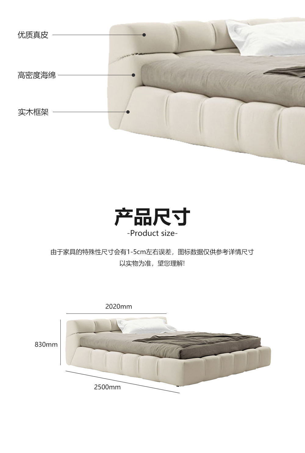 小红书系列 现代简约 实木框架+高回弹海绵+接触面头层牛皮+仿皮 1.8米床