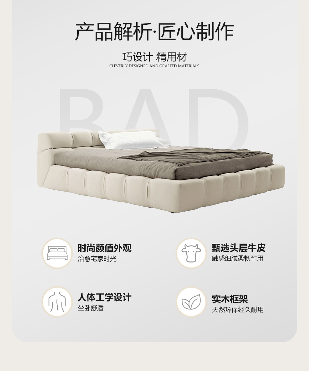 小红书系列 现代简约 实木框架+高回弹海绵+接触面头层牛皮 1.5米床
