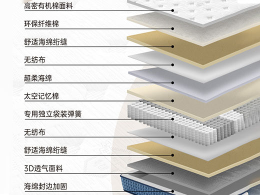 | 是否可定制:尺寸可定制,长宽加10CM以内+150元 | 产品材质:面料:高密有机棉面料 绗缝层:舒适海绵 舒适层: 超柔海绵 太空记忆棉 支撑层:加密独立袋装弹簧 四周梯形海绵护边 侧面:科技绒面料绗缝多孔透气海绵 底面:3D透气布绗缝多孔透气海绵 | 是否整装:卷包 |