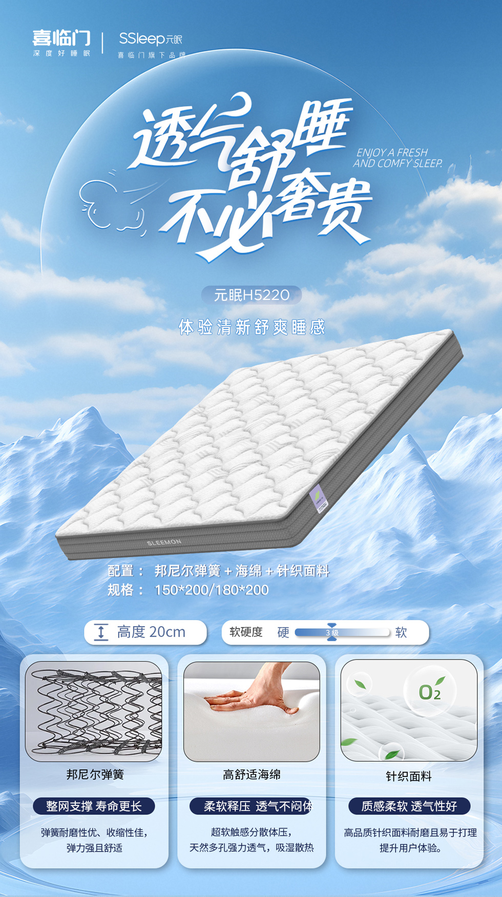 喜临门 独立袋装弹簧+3D材料+抗菌防螨棉+针织面料(抗菌防螨技术) 单面 1.8*2米 床垫 包邮¥3053