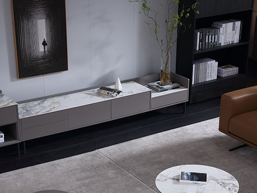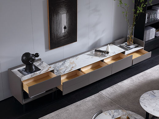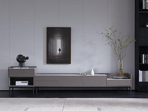 梵歌 现代简约 E1环保中纤板 三节滑珠导轨 6MM岩板石面 潘多拉 碳素钢五金架 钢化玻璃 炭灰+碳灰实色 电视柜¥3975