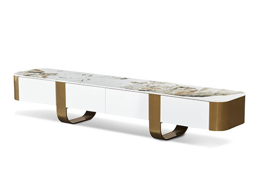 拜洛迪 轻奢 板木结合+岩板+拉丝香槟金不锈钢 白色 2米 电视柜¥7712