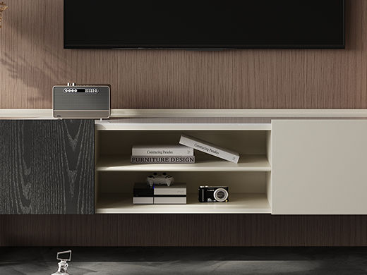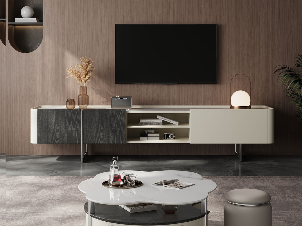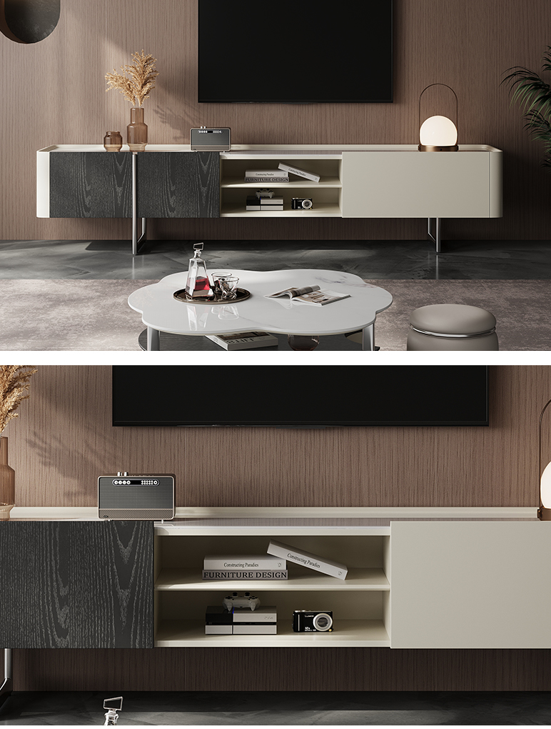 梵歌 现代简约 E1环保中纤板 三节滑珠导轨 6MM岩板石面 潘多拉 碳素钢五金架 钢化玻璃 炭灰+碳灰实色 电视柜¥3639