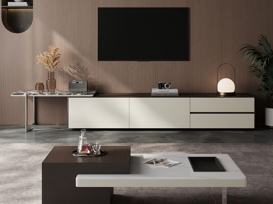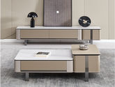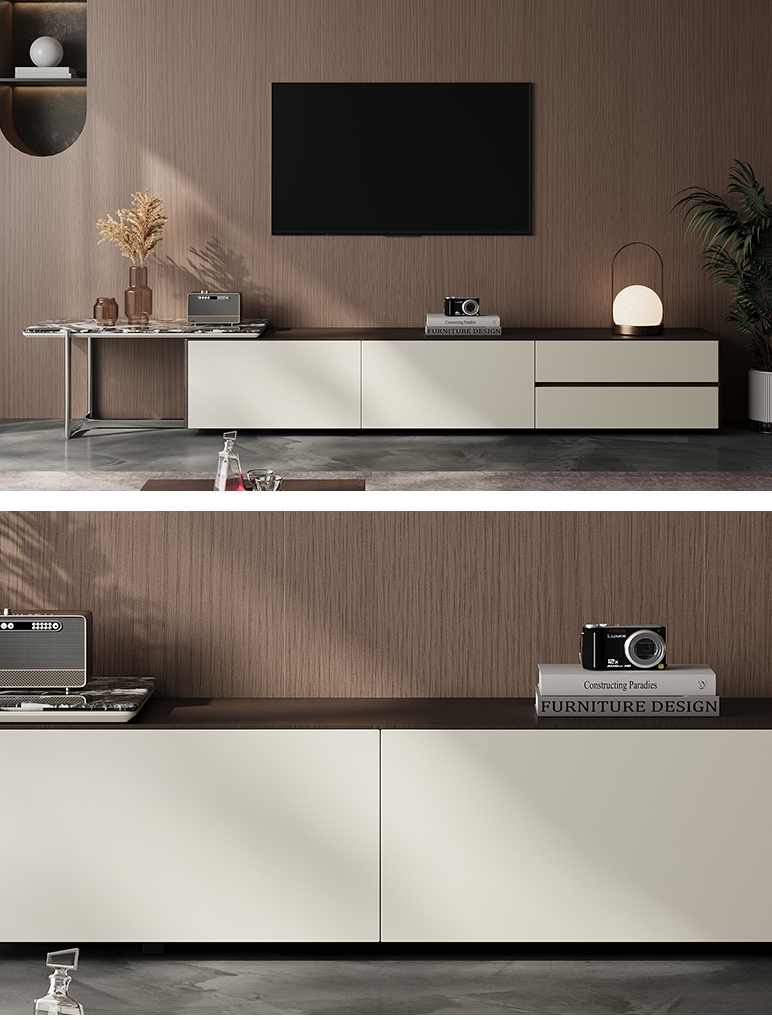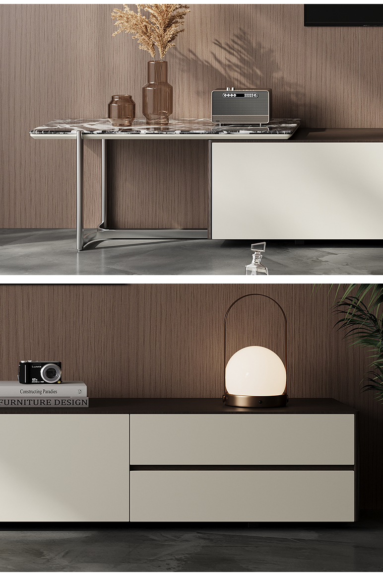 梵歌 现代简约 E1环保中纤板 三节滑珠导轨 6MM岩板石面 潘多拉 碳素钢五金架 钢化玻璃 炭灰+碳灰实色 电视柜¥3639