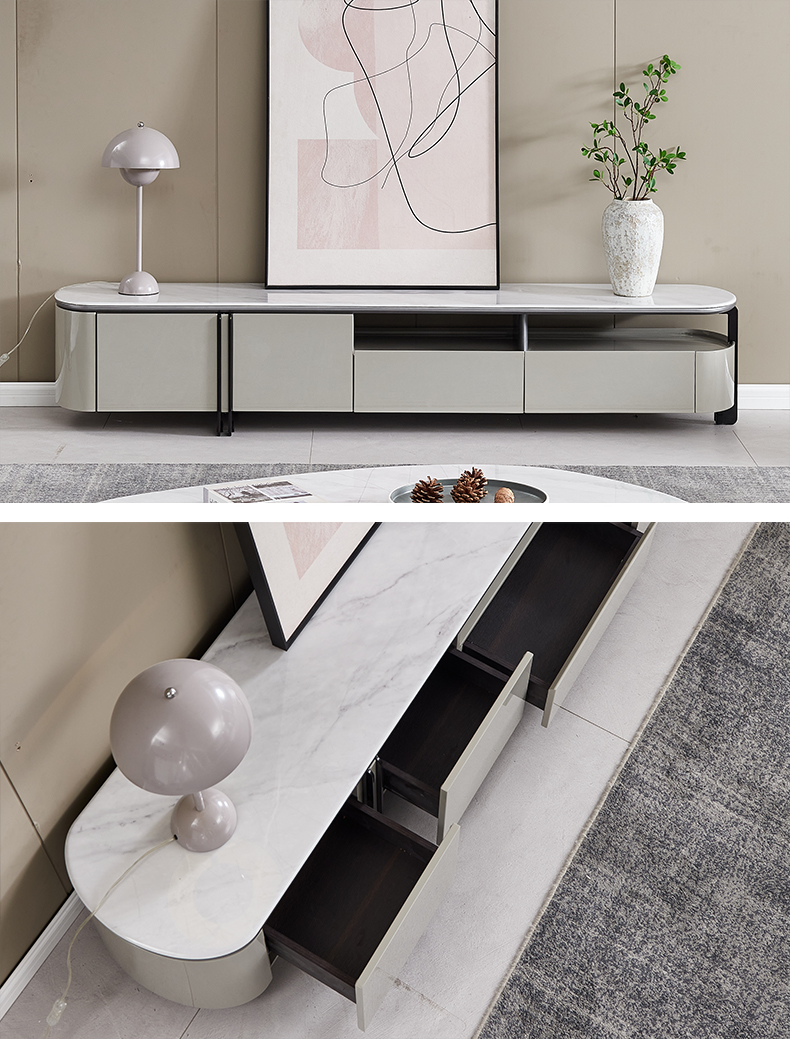 梵歌 现代简约 E1环保中纤板 三节滑珠导轨 6MM岩板石面 潘多拉 碳素钢五金架 钢化玻璃 炭灰+碳灰实色 电视柜¥3639