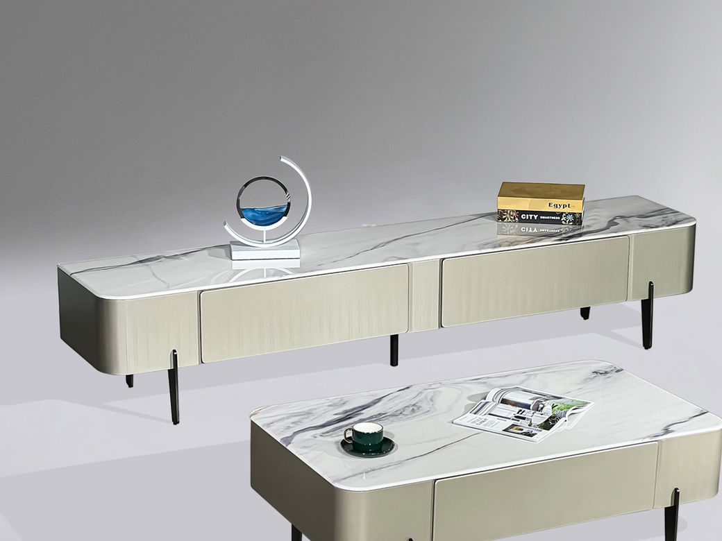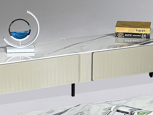 甄品家具 现代简约 安卡拉白亮光微晶石7.5MM+香槟色拉丝工艺+电镀脚 2米电视柜