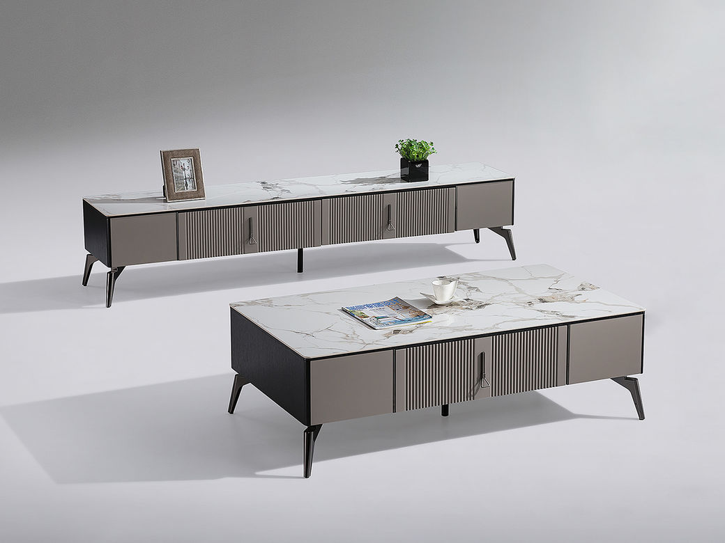 甄品家具 现代简约 烤漆柜体+亮光雪山石岩板面+枪色五金脚架 2米电视柜(未开电源孔)(不含斗柜)¥2440