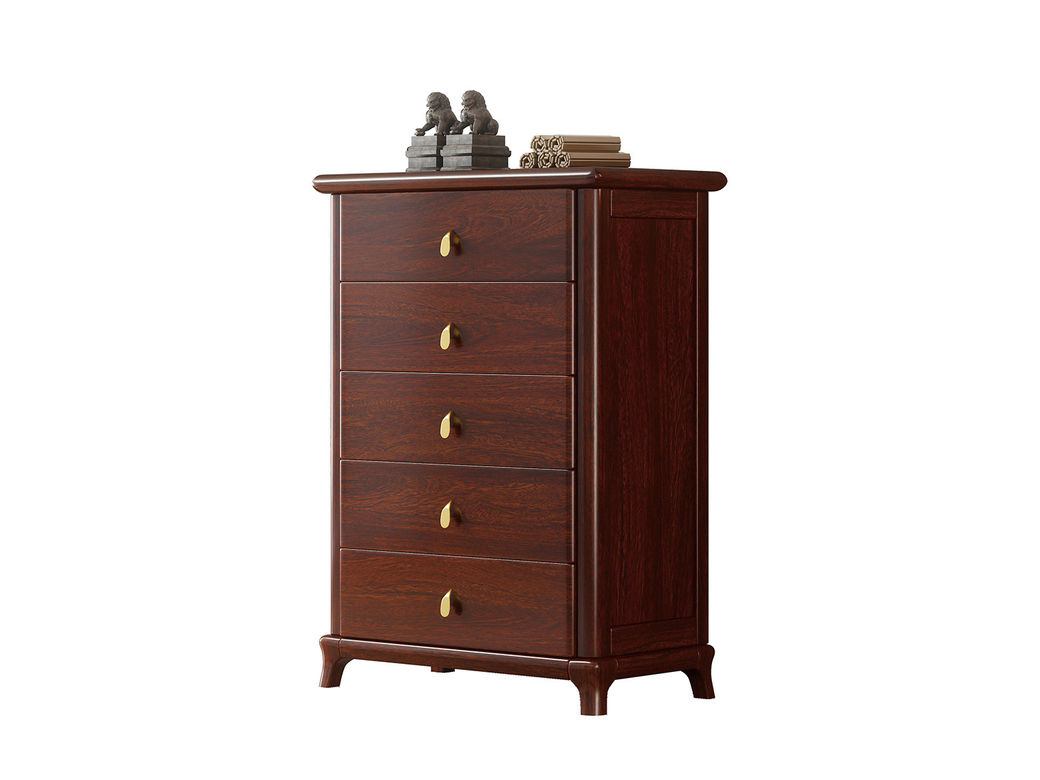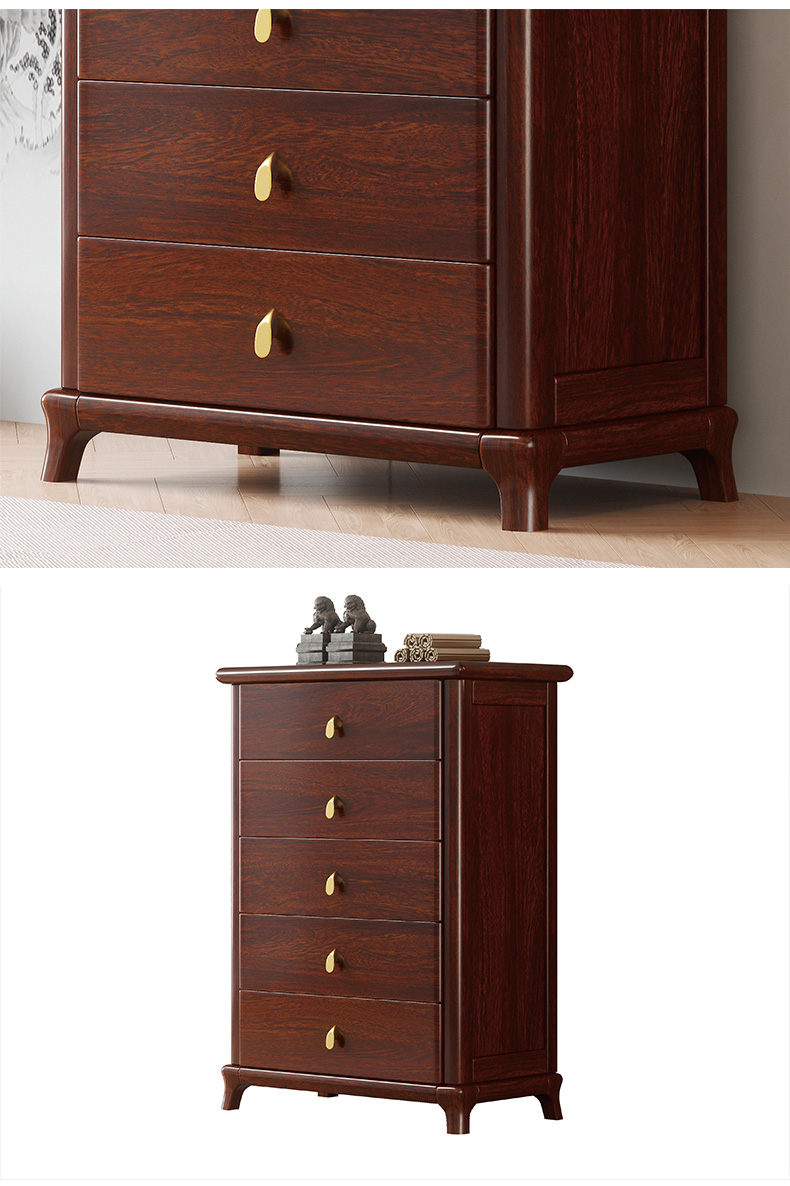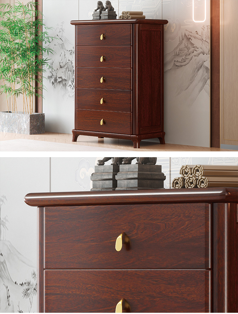 宝瑞·檀风 新中式 印尼金花梨木框架+多层实木板贴皮+电镀五金 紫檀色 五斗柜