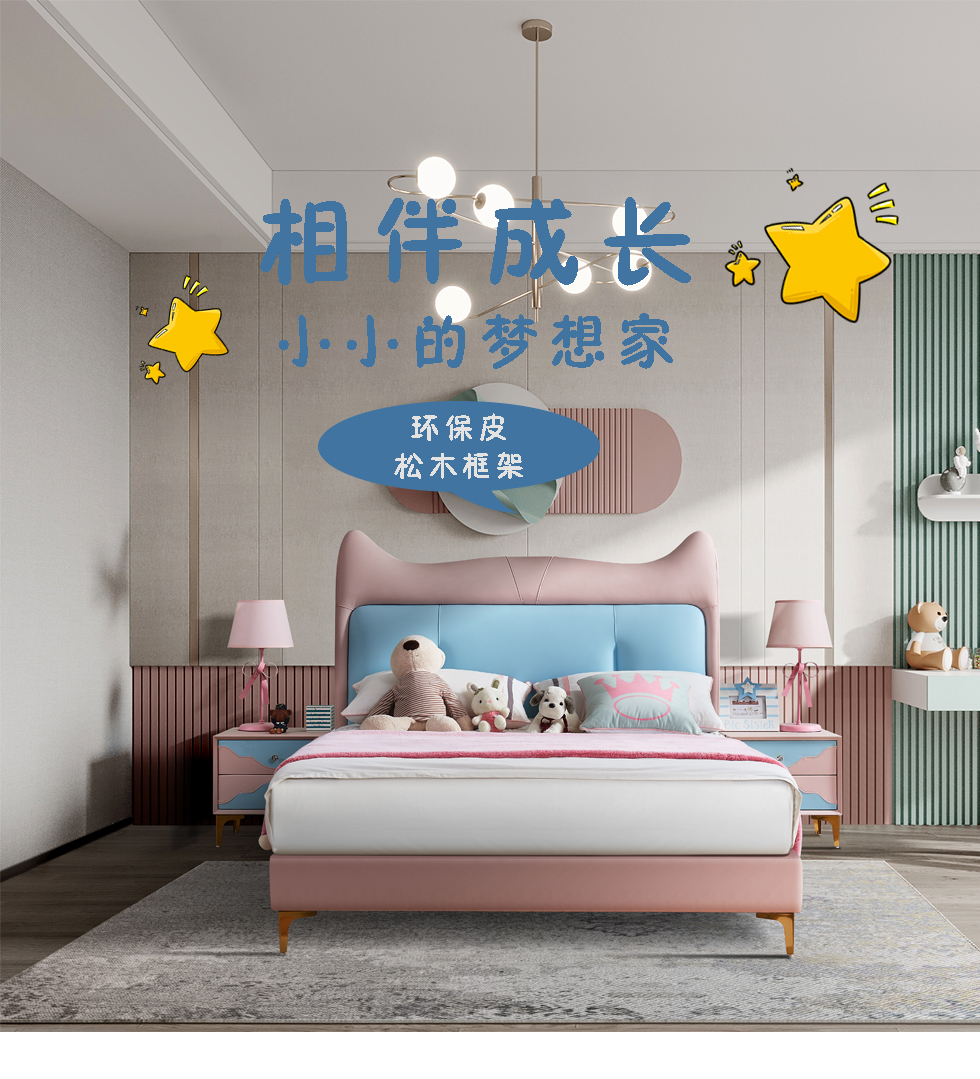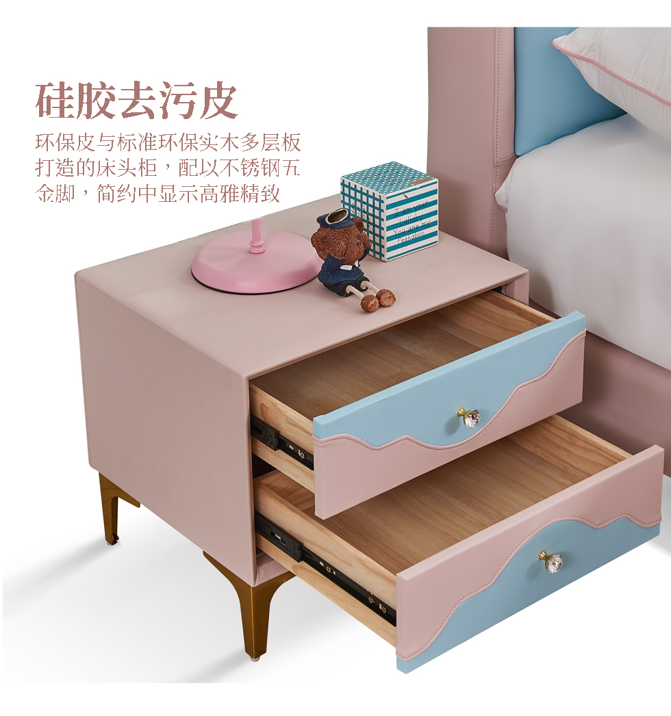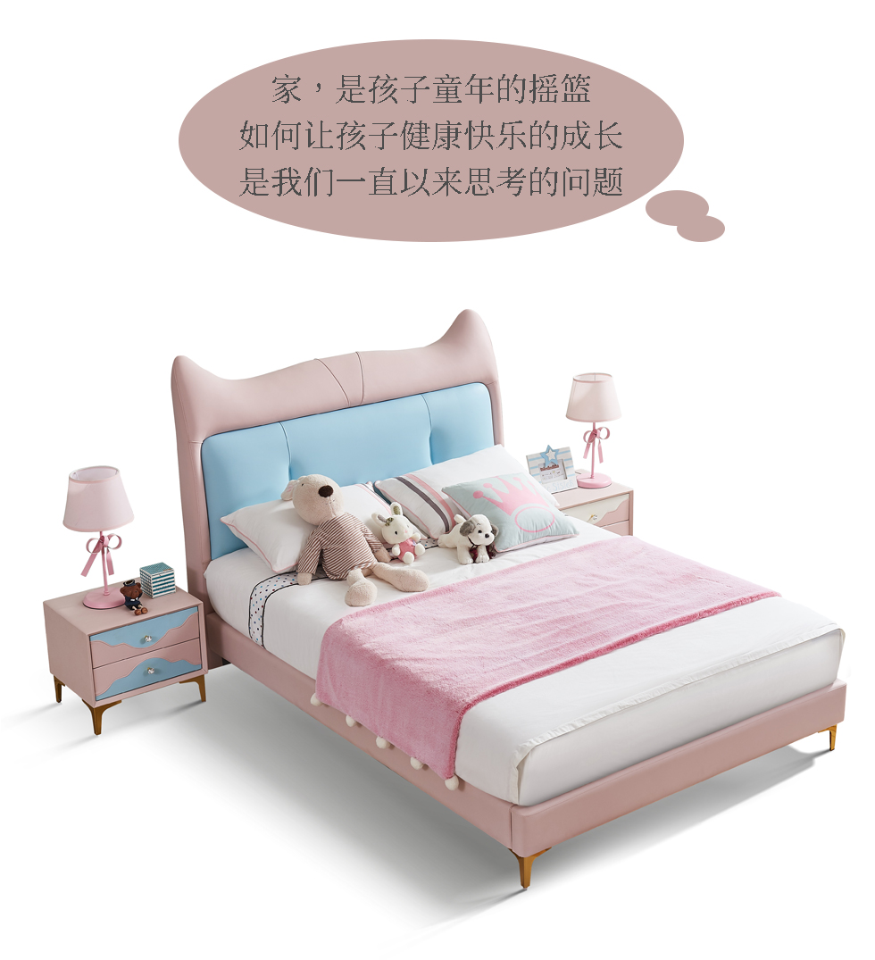快乐童眠 儿童床 硅胶去污皮+钢木排骨架+进口俄罗斯松木框架+高回弹海绵 粉蓝色 1.5M软床