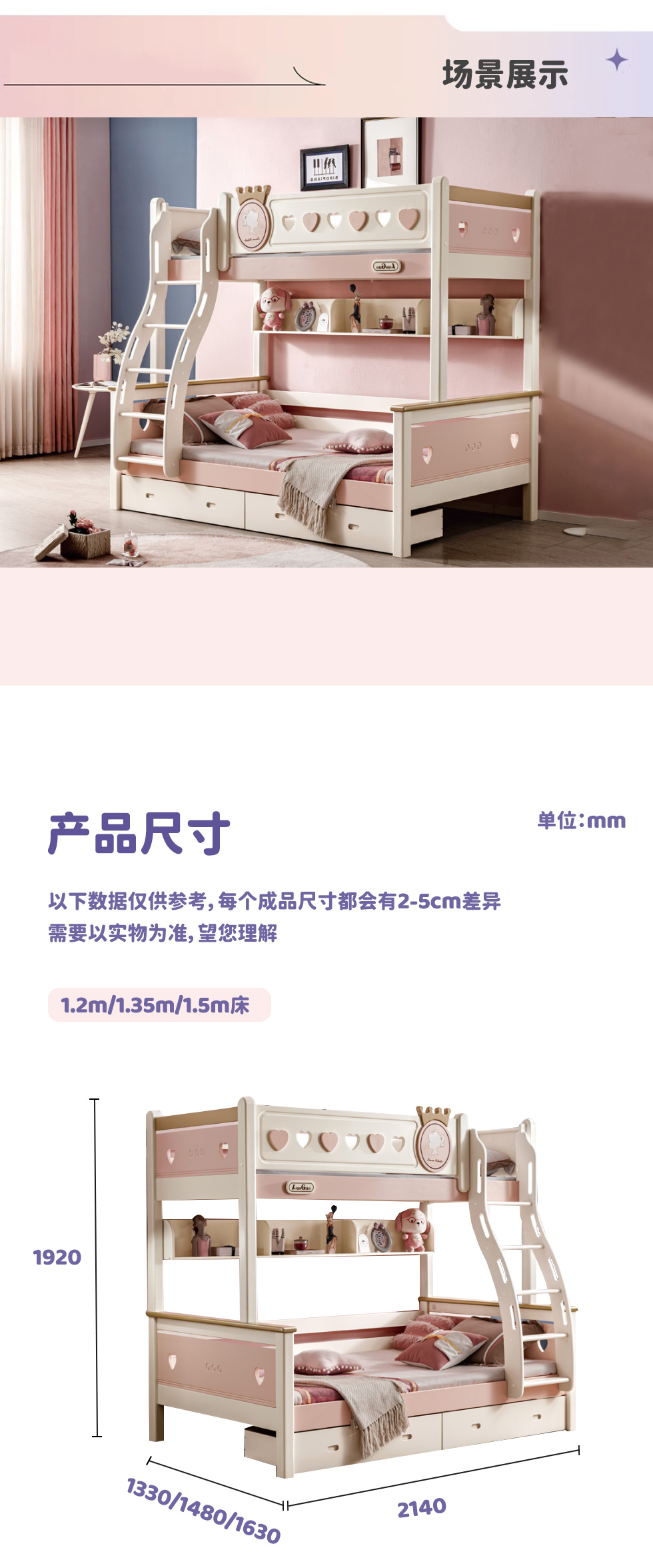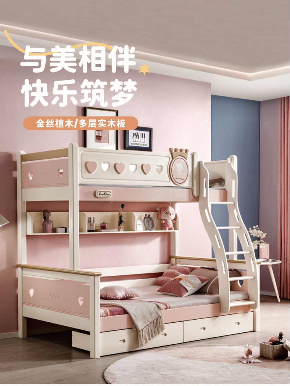 帕帕贝奇 儿童 金丝檀木+全实木(不含书架,步梯,床下抽屉) 白+粉 1.2米