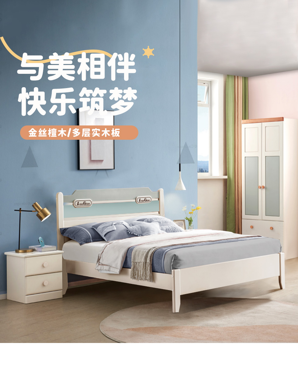 帕帕贝奇 儿童 金丝檀木+全实木 白+绿 1.5米床