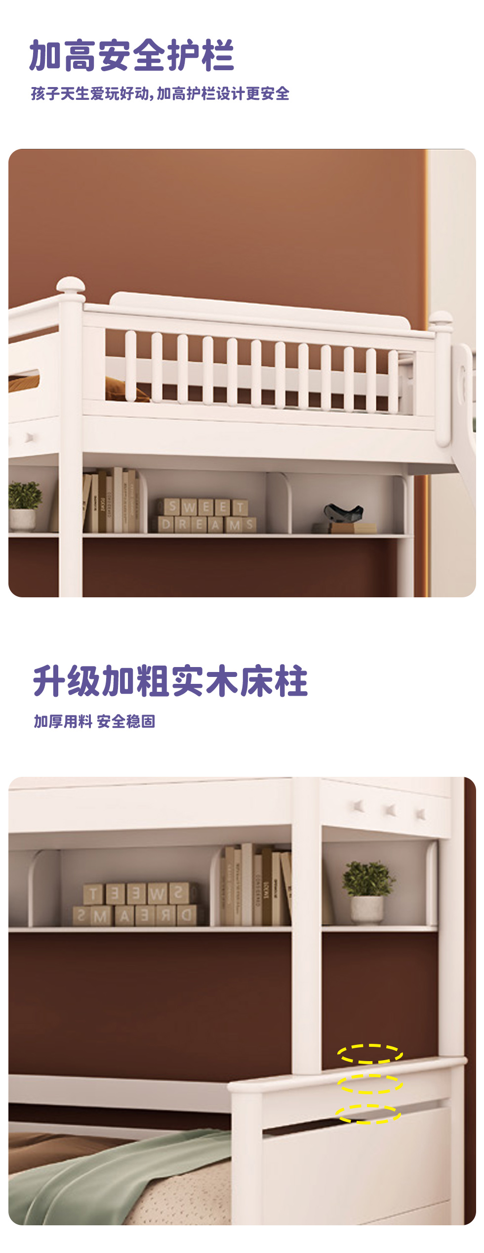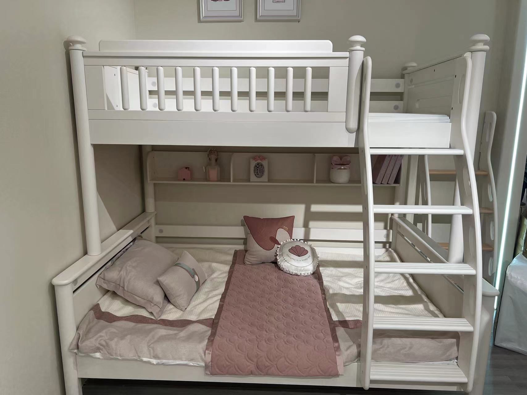 帕帕贝奇 儿童 金丝檀木+全实木(不含书架)上下床同宽 白+粉 1.0米上下床定制