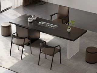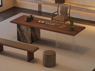 上铭轩 极简 50MM实木多层板+外贴天然木皮面板深胡桃/开放黑+嵌入式茶盘+550*600实木多层板储物柜+外贴岩板(/威尼斯棕)可置放饮水桶和废水桶+200*600亚克力脚架+全自动智能抽水茶艺炉+赠臻品茶具、高档茶桶等 岛台 茶台