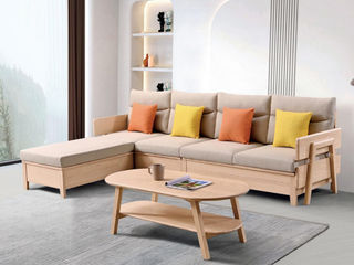 简森曼 北欧风 科技绒+扶手坐板背架为橡胶木 座板下两条托方为松木 原木色 4人位+ 脚踏 【实木拼接工艺】 3.3米沙发